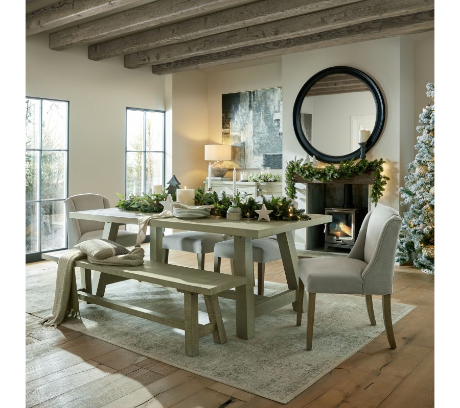 Stôl výborne ladí s drevenými alebo čalúnenými stoličkami v neutrálnych, pastelových či prírodných tónoch, s doplnkami z keramiky, ľanu alebo juty. Krásne vynikne aj s textíliami v krémovej, pieskovej či olivovej farbe.