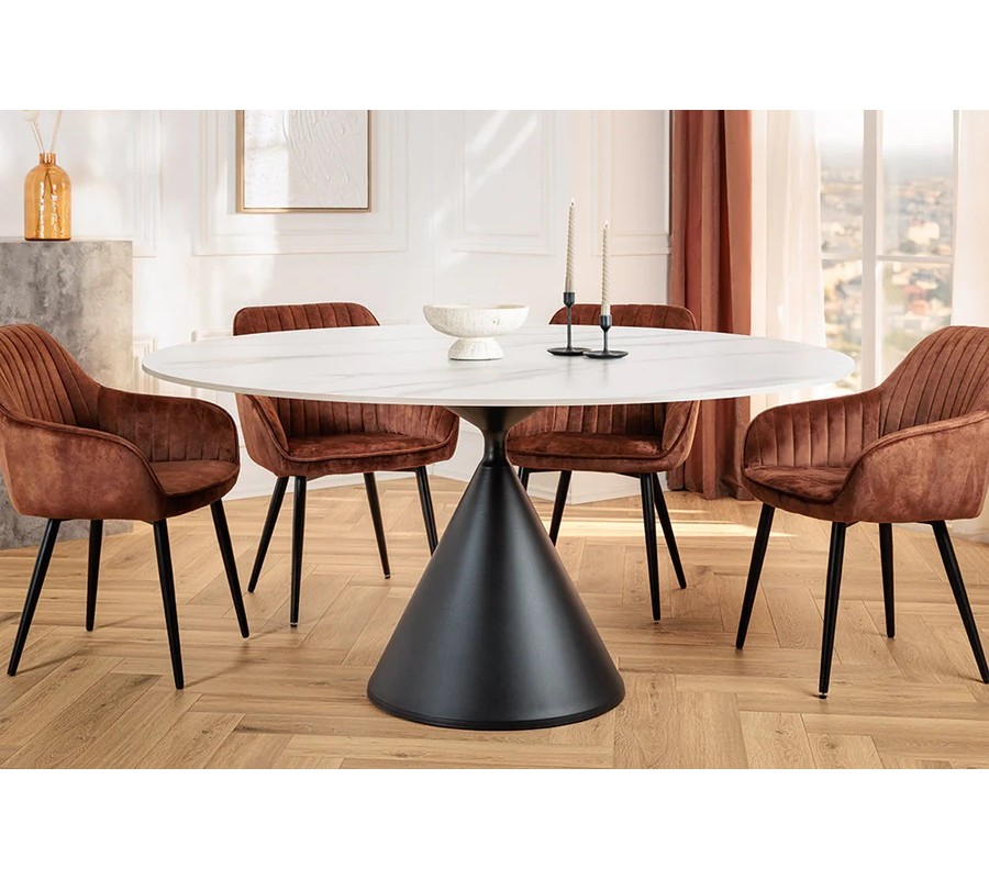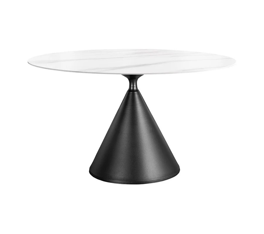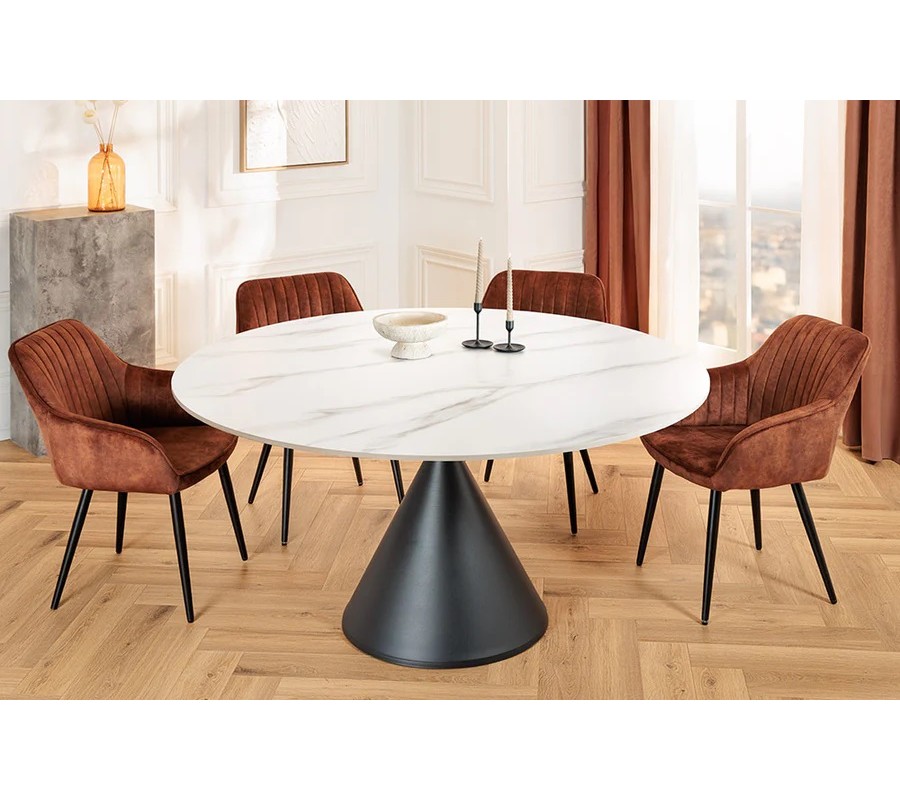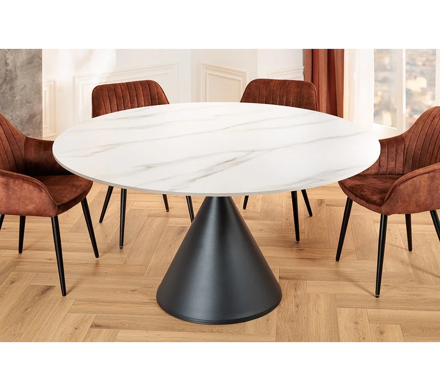 Dizajnový moderný okrúhly jedálenský stôl Eskarina s bielou mramorovou doskou z keramiky a čiernou geometrickou nohou 135 cm