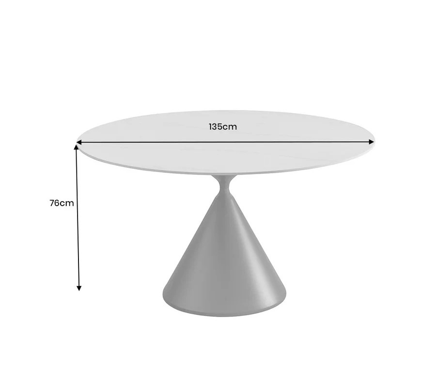 Stôl má okrúhlu vrchnú dosku s priemerom 135 cm, za ktorú pohodlne usadíte 5 až 6 osôb. Je vyrobená z keramiky, ktorá zaručuje pevný a odolný povrch, nenáročný na údržbu. Zdobí ju elegantný dizajn bieleho mramoru s jemným sivým žilkovaním, ktorý pôsobí luxusným dojmom.