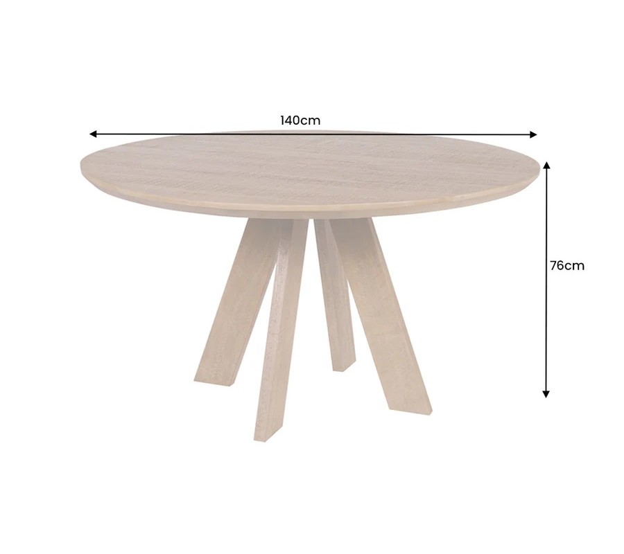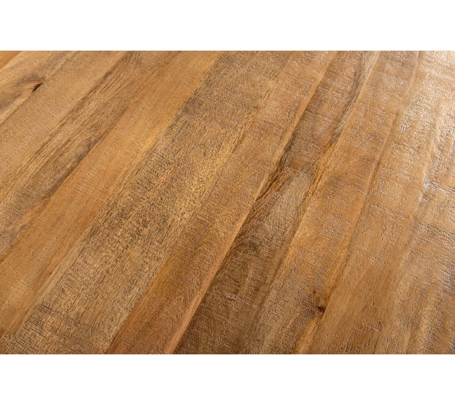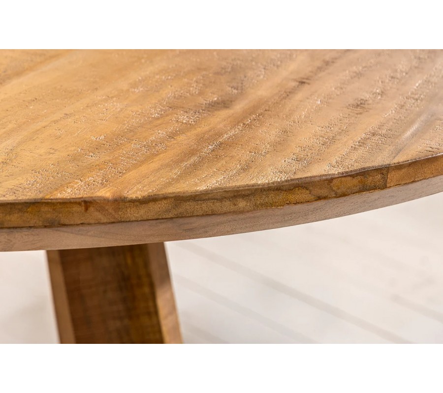 Okrúhly jedálenský stôl Arlo je výrazným kúskom v rustikálnom a prírodne ladenom štýle. Je vyrobený z masívneho mangového dreva s bohatou viditeľnou štruktúrou, ktorá podčiarkuje jeho autentický a remeselný charakter. Jeho okrúhla doska má jemne zrazené hrany a príjemný svetlohnedý tón, ktorý pôsobí prirodzene a útulne.