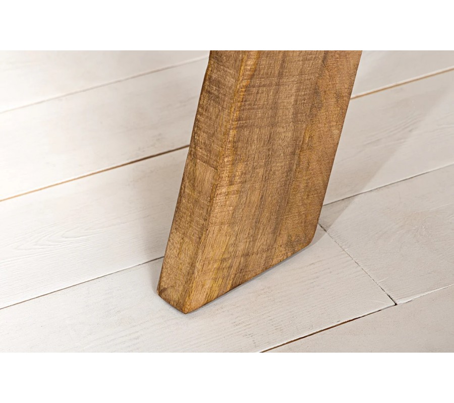 Stôl stojí na štyroch plochých vyosených nožičkách, ktoré smerujú mierne von a zabezpečujú výbornú stabilitu. Táto moderná konštrukcia pôsobí odľahčene, no zároveň robustne, čo ho predurčuje na každodenné rodinné stolovanie. Masívne drevo dodáva stolu výnimočnú pevnosť aj dlhú životnosť.