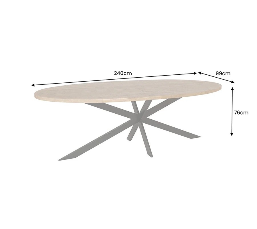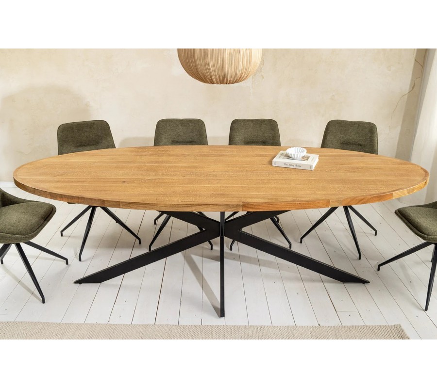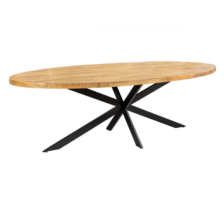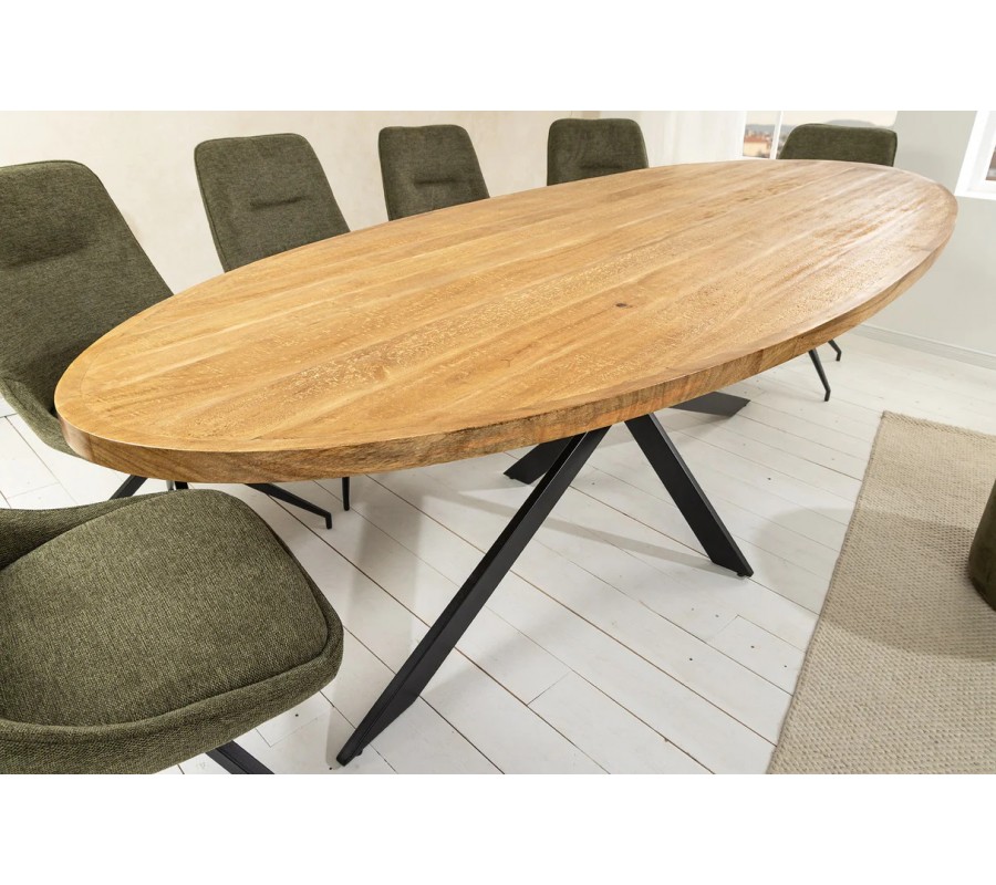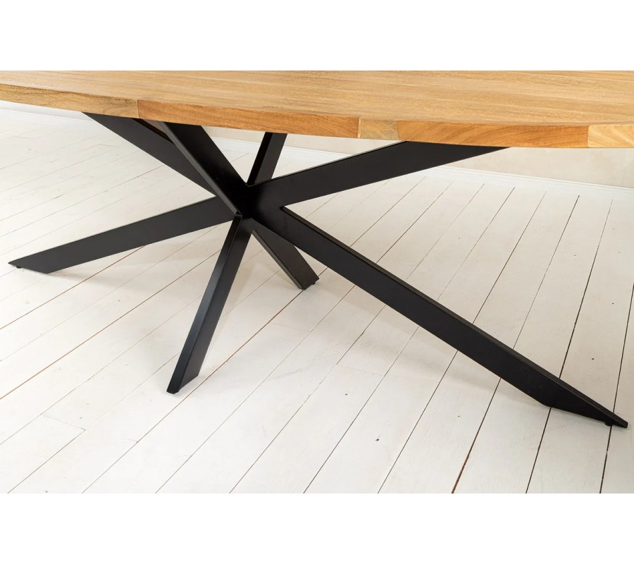Industriálny oválny hnedý jedálenský stôl Comedor z masívneho mangového dreva s čiernymi prekríženými kovovými nohami 240 cm