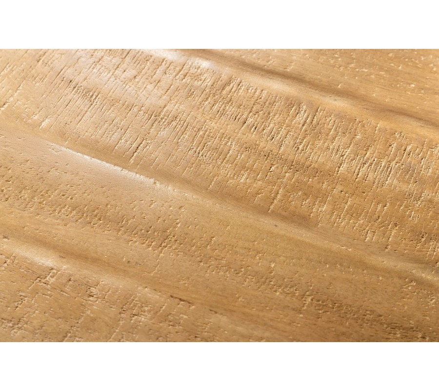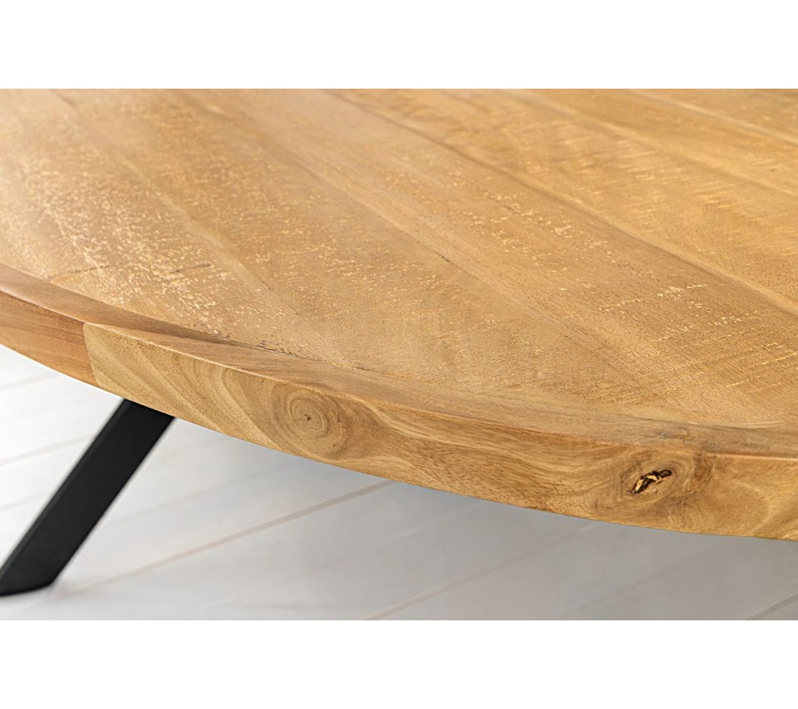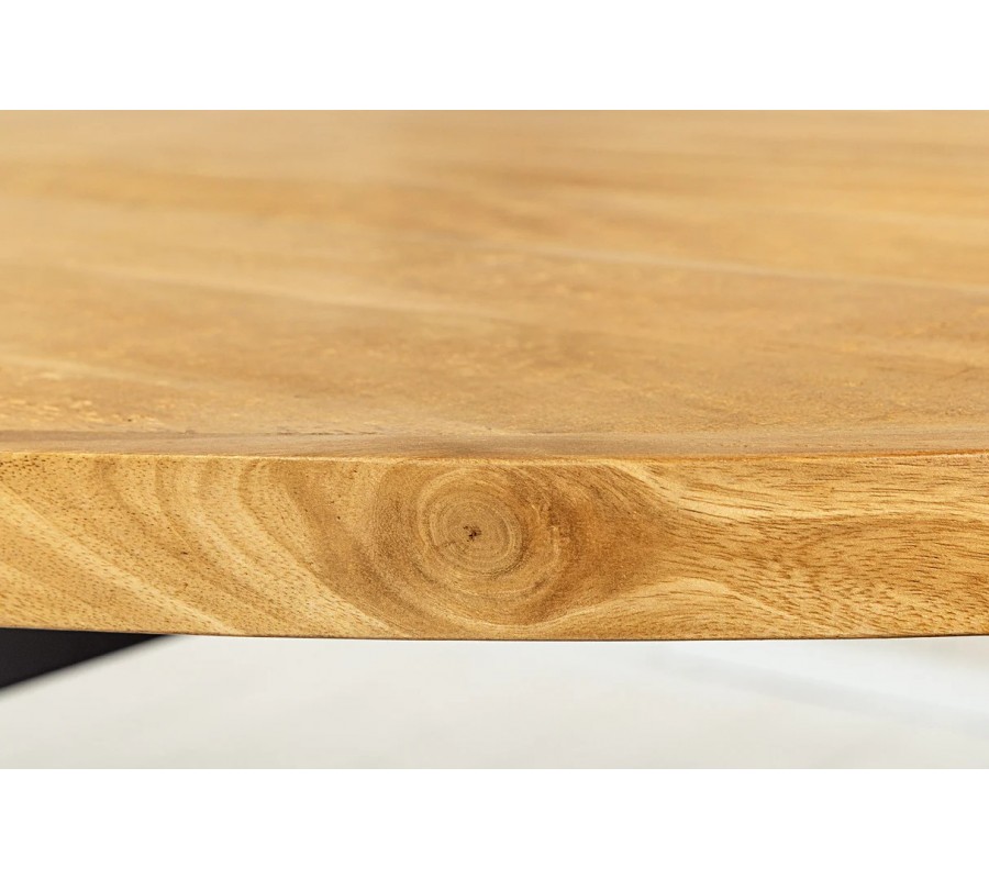 Jedálenský stôl Comedor zaujme už na prvý pohľad svojím oválnym tvarom a výraznou kresbou masívnej mangovej dosky. Povrch dreva je lakovaný, čo zvýrazňuje jeho prirodzenú textúru a zároveň zabezpečuje ochranu pri bežnom používaní. Hrany stola sú mierne zaoblené, čo zjemňuje jeho robustný výraz.
