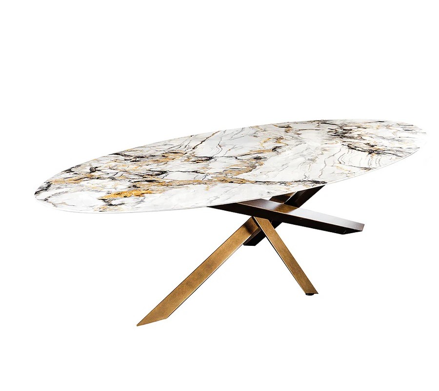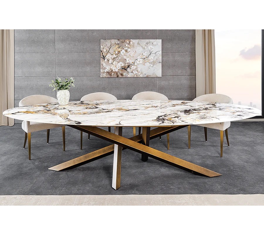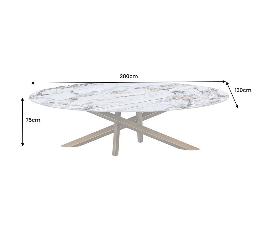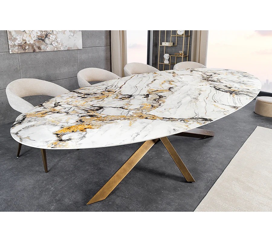 Luxusný glamour keramický biely oválny jedálenský stôl Imperial s mramorovým vzorom s bronzovými prekríženými nožičkami 280 cm