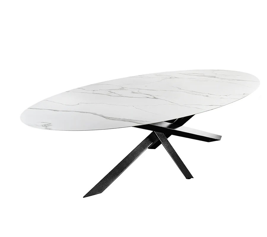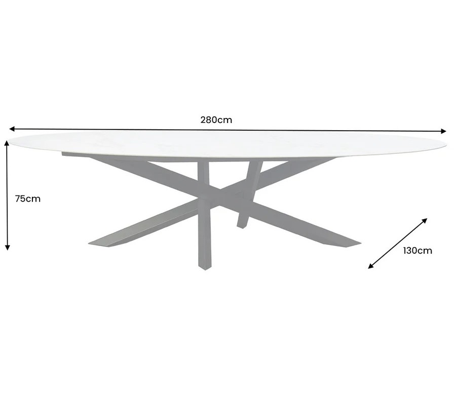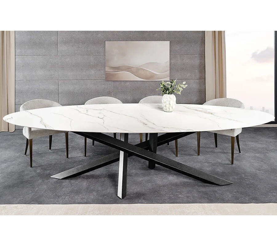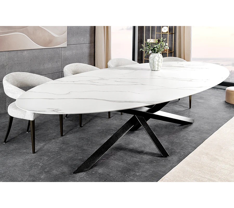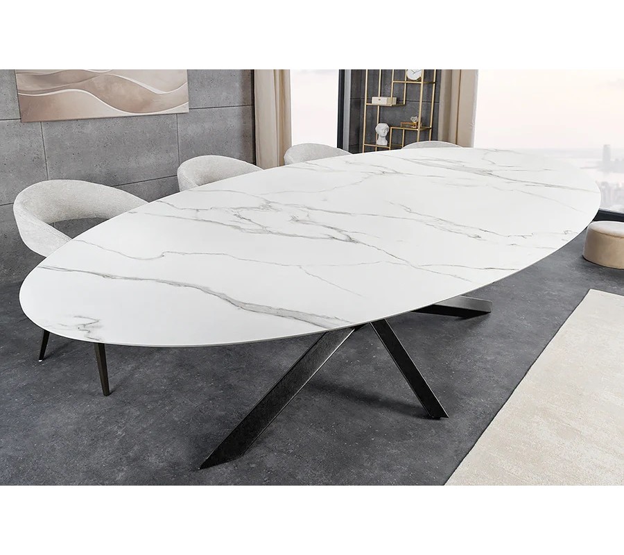 Luxusný industriálny keramický oválny jedálenský stôl Imperial z bieleho mramoru so sivým žilkovaním s čiernymi nožičkami 280 cm
