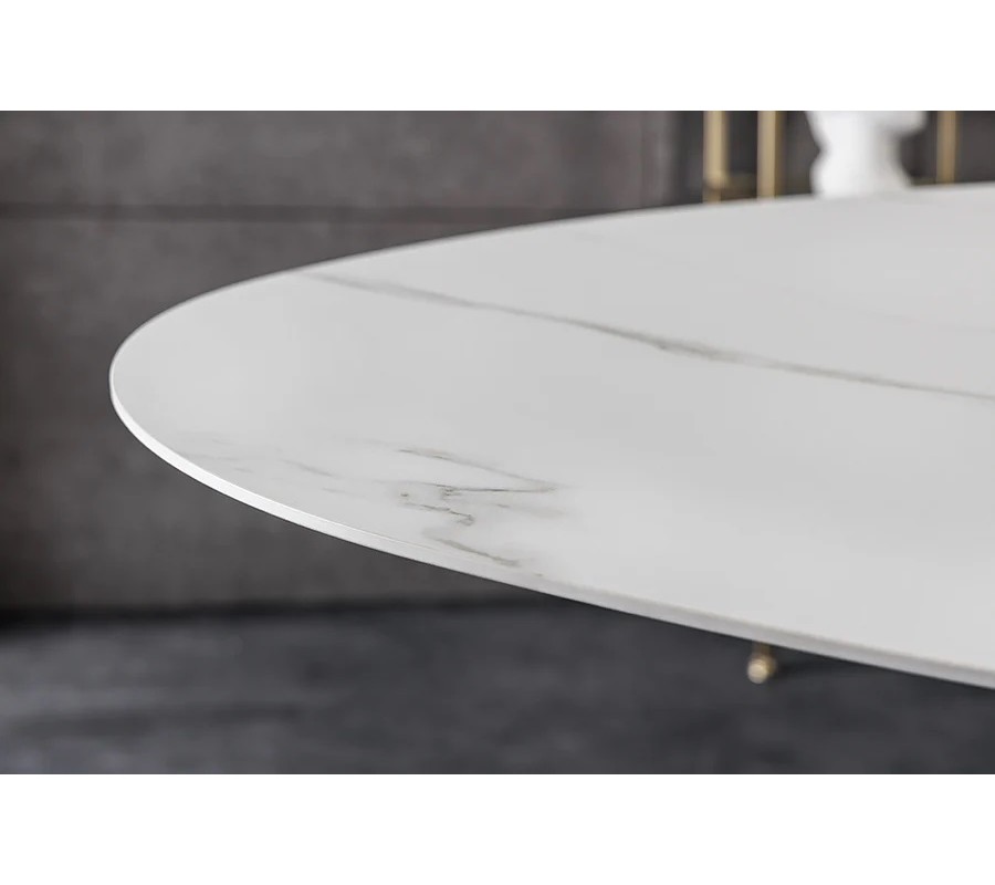 Doska je vyrobená z bielej keramiky, ktorá je pevná, odolná a jednoduchá na údržbu. Na jej povrchu sa nachádza mramorový vzor s jemným sivým žilkovaním, ktorý dodáva stolu luxusný a moderný vzhľad. Zaoblené hrany zjemňujú celkový vzhľad a podčiarkujú nadčasovú eleganciu.