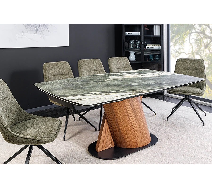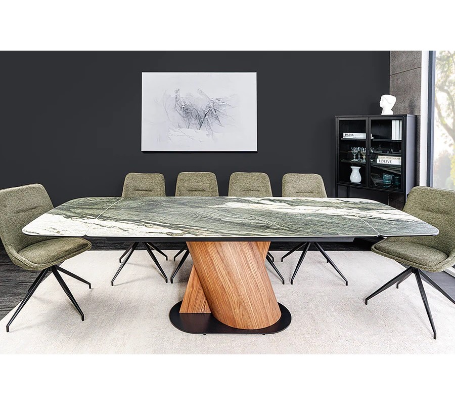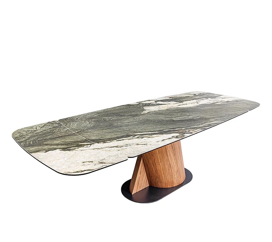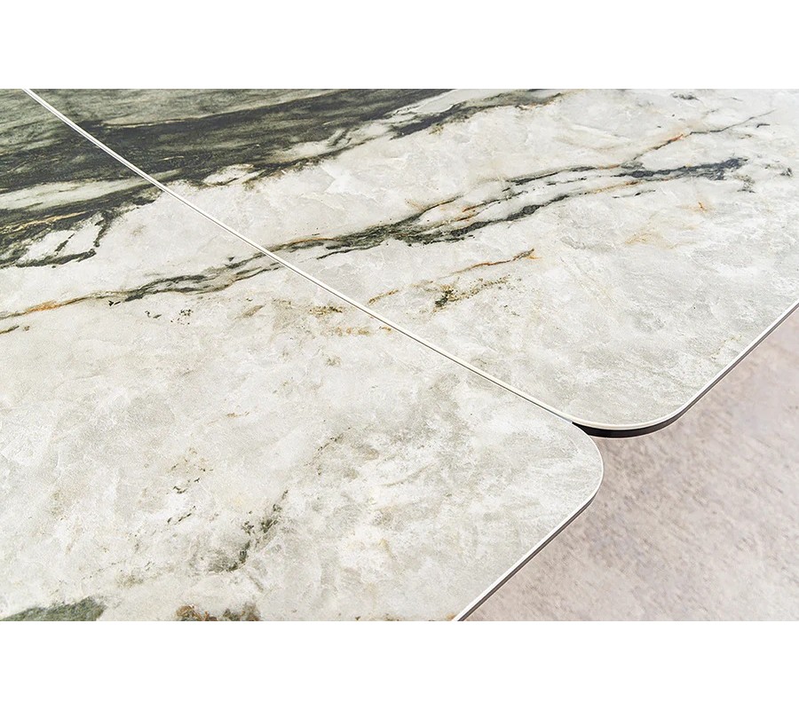 Vrchná časť je vyrobená z odolnej keramiky a disponuje praktickým rozkladacím mechanizmom, vďaka ktorému možno stôl predĺžiť z pôvodných 180 cm až na 260 cm. Táto funkcia zabezpečuje, že stôl poskytuje dostatok priestoru až pre 8 až 10 osôb, čím pohodlne poslúži pre väčšie rodinné stolovanie alebo spoločenské stretnutia.
