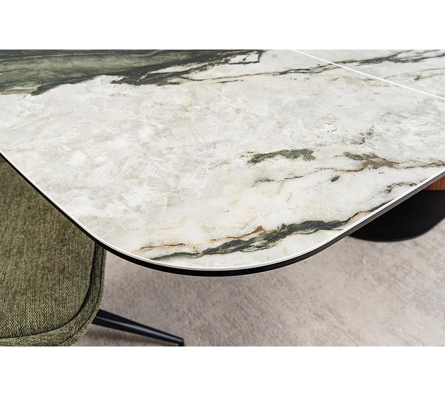 Povrch dosky zdobí výrazný mramorový vzor vo farebnej kombinácii sivozelenej a bielej. Zelené plochy majú charakter jemného žilkovania, ktoré pripomínajú štruktúru prírodného kameňa, zatiaľ čo biely podklad dodáva stolu svetlosť a luxusný výraz.