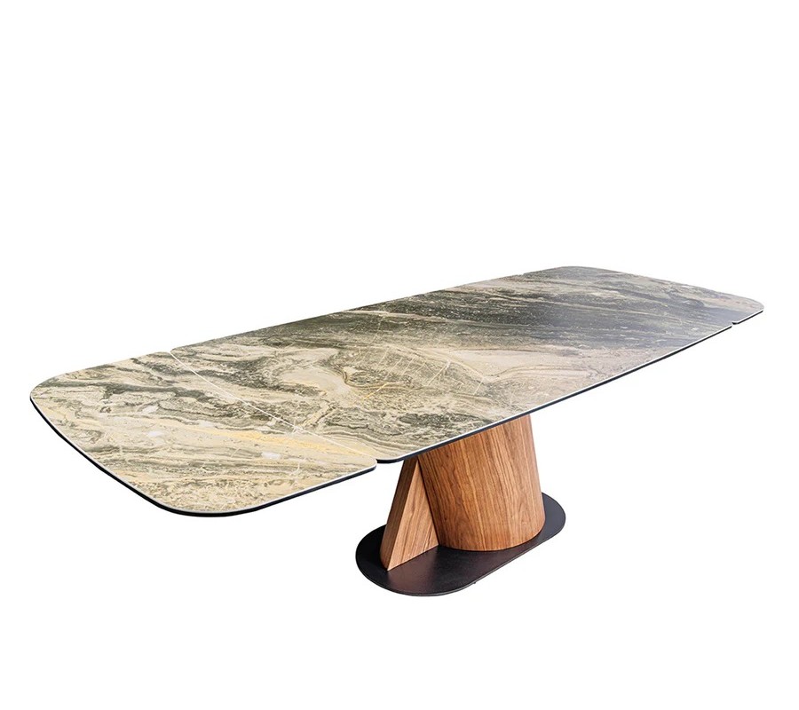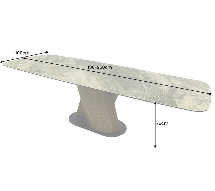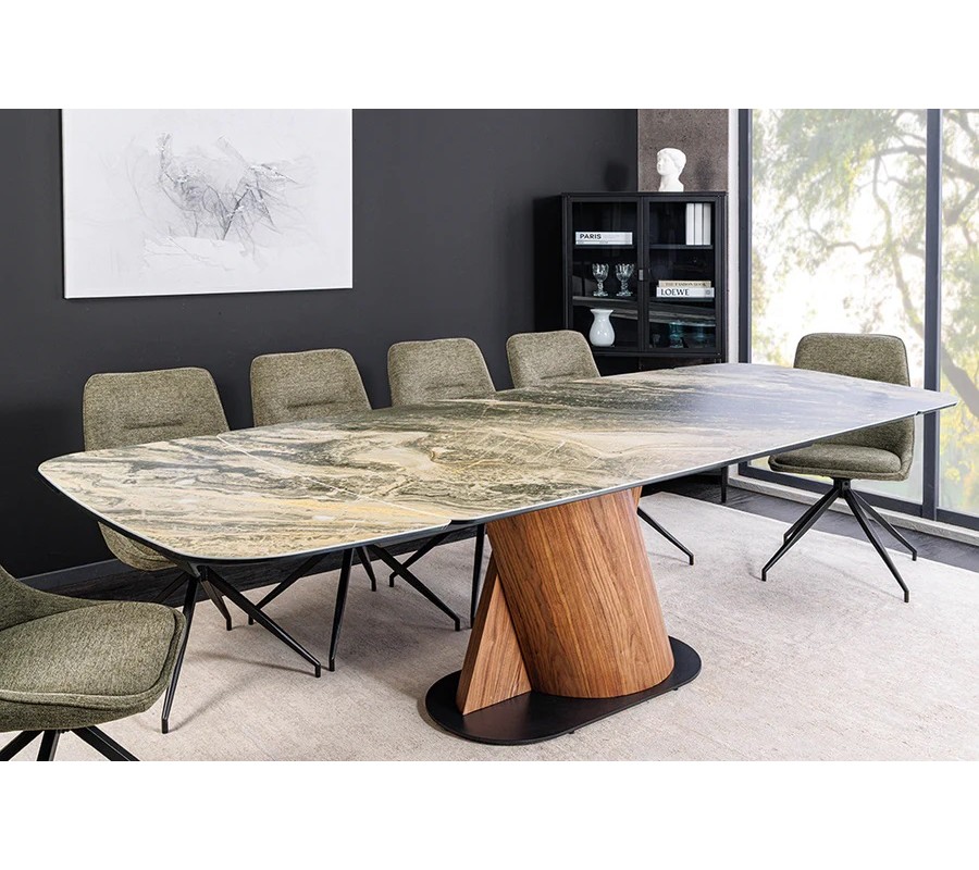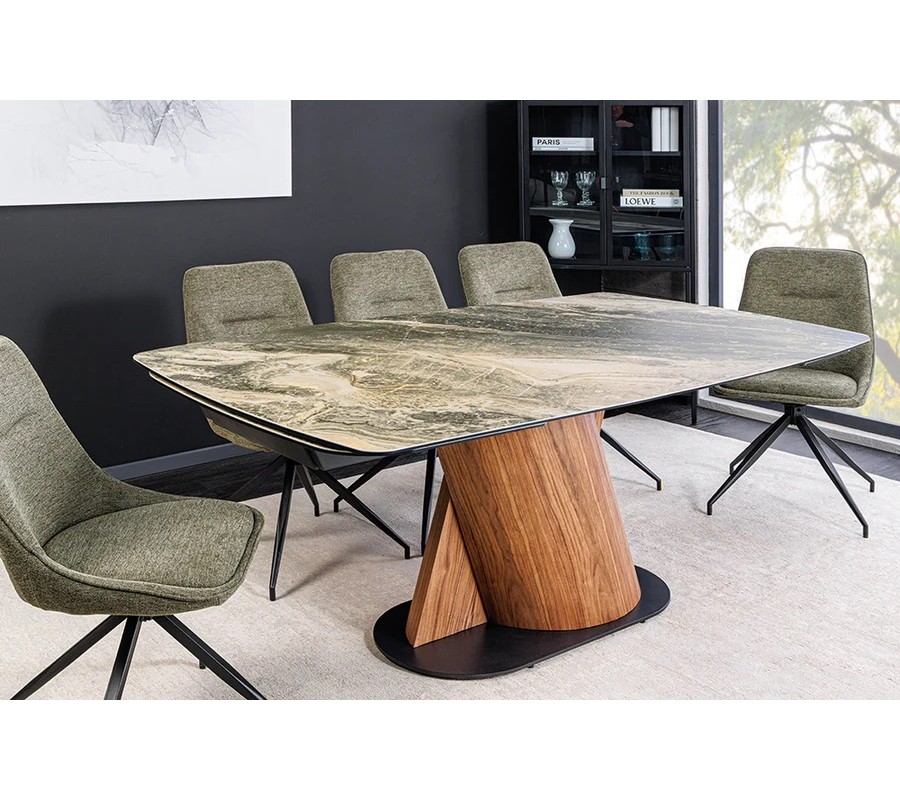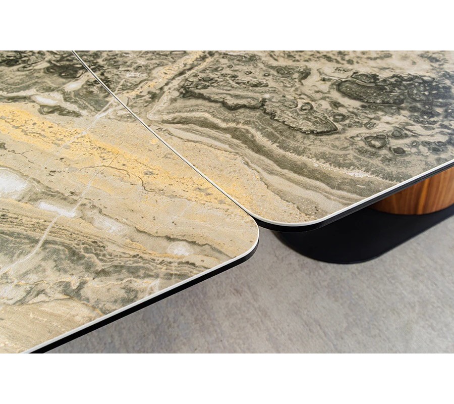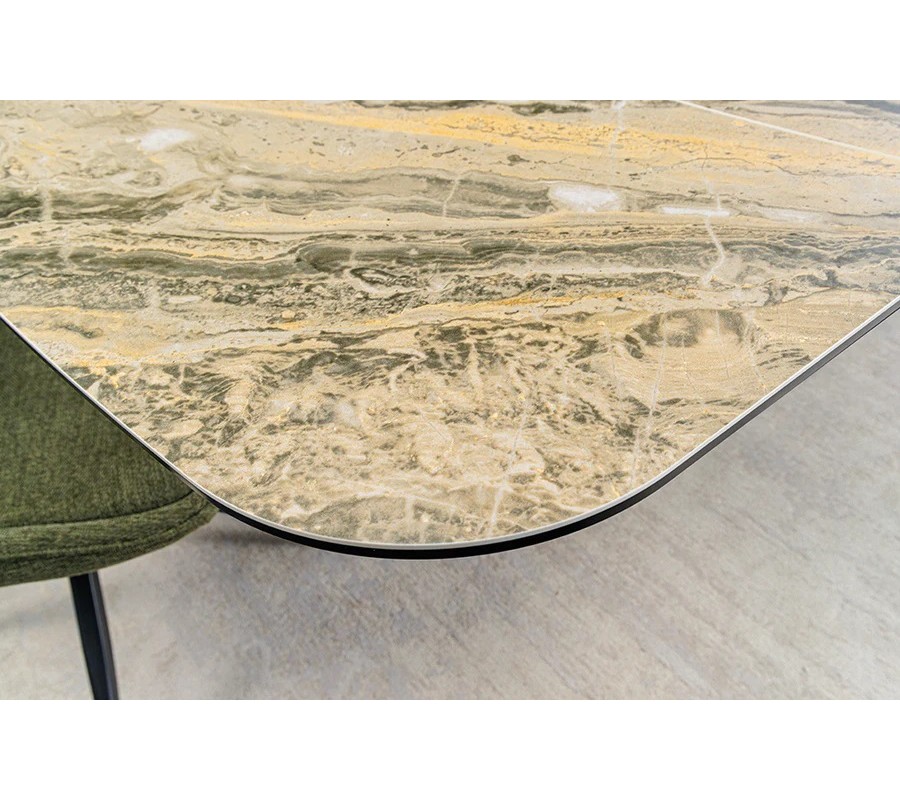 Vrchná doska je vyrobená z keramiky, ktorá poskytuje odolný a na údržbu nenáročný povrch. Zdobí ju exkluzívny dizajn mramoru s expresívnou kresbou v zemitých odtieňoch zelenej, béžovej, hnedej a sivej. Vďaka nej bude stôl vizuálnym stredobodom vašej jedálne.
