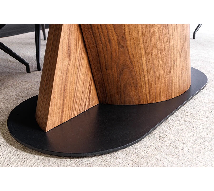 Prírodný vzhľad mramoru výborne dopĺňa noha z dyhovaného orechového dreva v naturálnej teplej hnedej farbe. Má výraznú kresbu letokruhov, ktoré sú organizované zvislo a opticky ju tak predlžujú. Noha je zložená z dvoch prvkov v tvare polvalca, ktoré sú umiestnené v modernom prekríženom dizajne. V spodnej časti nohu spevňuje oválna čierna kovová podstava.