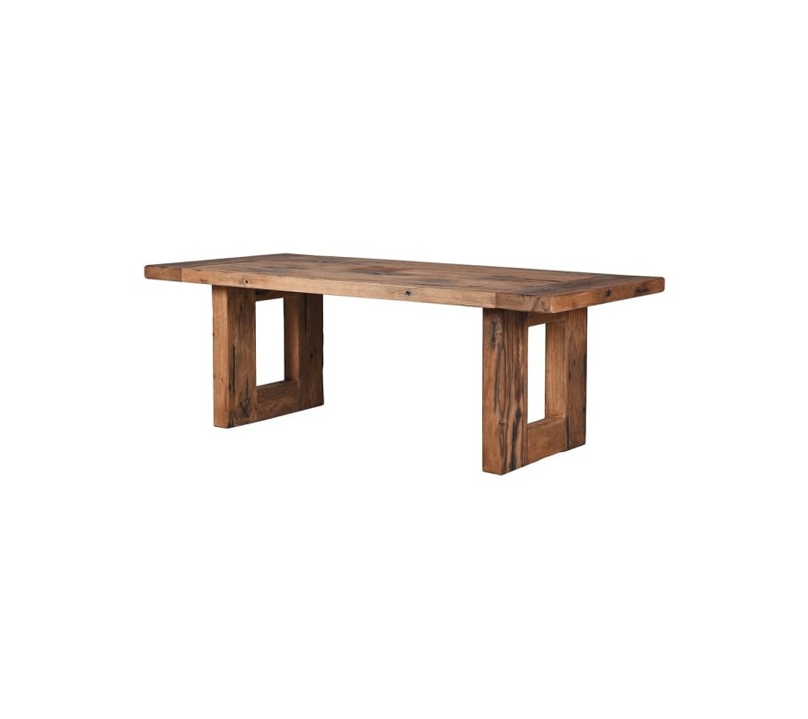 Stôl má robustnú obdĺžnikovú dosku s hrubým profilom, ktorá pôsobí pevne a reprezentatívne. Stabilitu mu dodávajú mohutné štvorcové nožičky, vytvorené zo štyroch hranolov spojených tak, aby tvorili rám s otvoreným stredom. Tento dizajn zabezpečuje nielen vysokú pevnosť, ale aj výrazný dekoratívny prvok, ktorý okamžite pritiahne pozornosť.