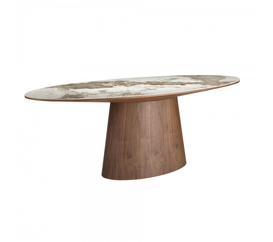 Vrchná doska má predĺžený oválny tvar a je vyrobená z bieleho porcelánu s mramorovou kresbou s výrazným žilkovaním v sivých a hnedých tónoch. Lesklý povrch dodáva stolu luxusný vzhľad, pričom porcelán je mimoriadne pevný, odolný a nenáročný na údržbu. Zo spodnej časti je spevnená orechovou dyhovanou doskou v hnedej farbe, ktorá nielen že zvyšuje stabilitu, ale aj harmonicky ladí s celkovým dizajnom.