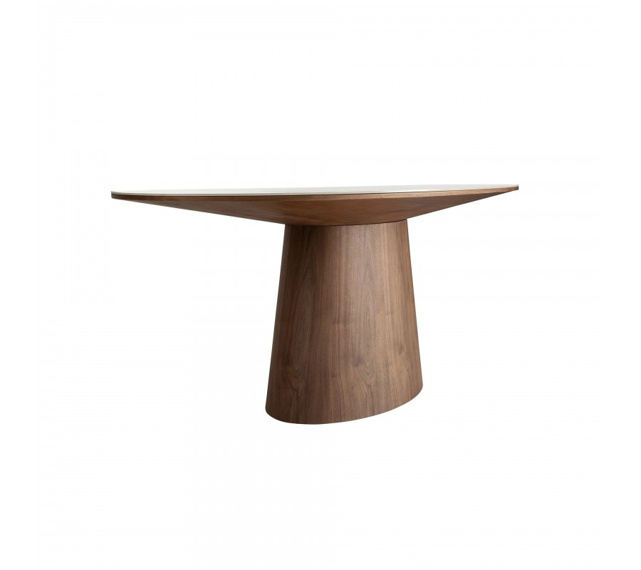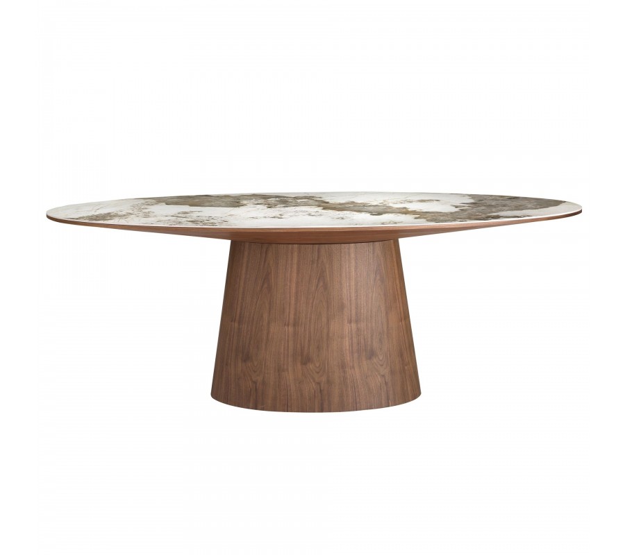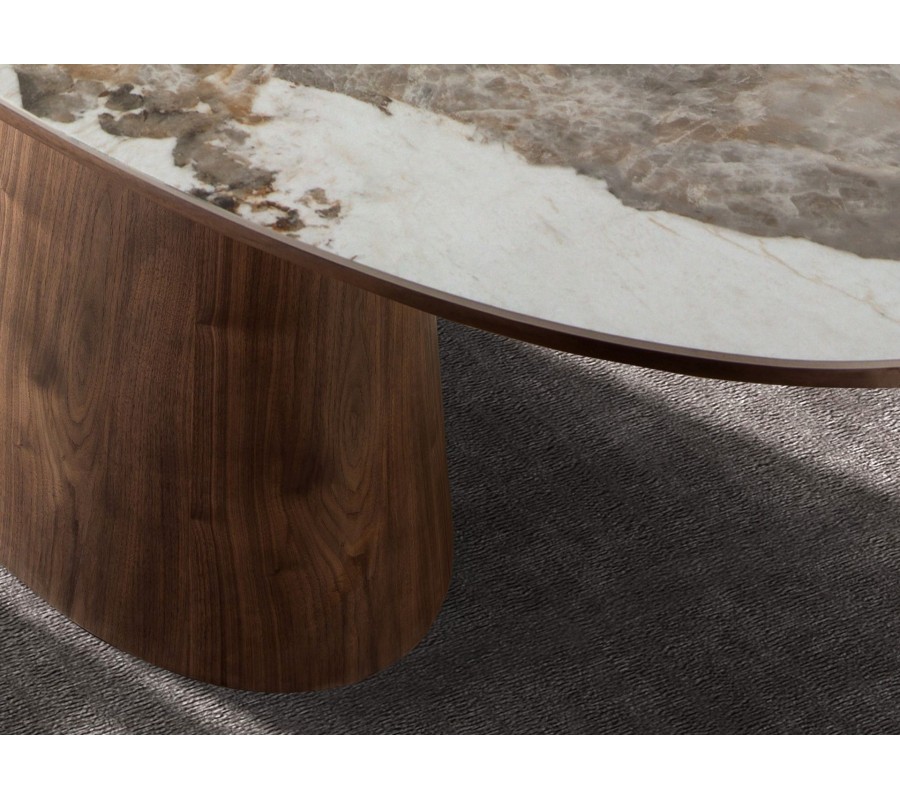 Stôl disponuje robustnou centrálnou nohou oválneho tvaru. Tá je vyrobená z orechového dyhovaného dreva v tmavohnedom odtieni s jemným leskom, na ktorom prirodzene vyniká kresba dreva. Tento detail tvorí kontrast útulného a prírodného charakteru k chladnej elegancii porcelánového mramoru.