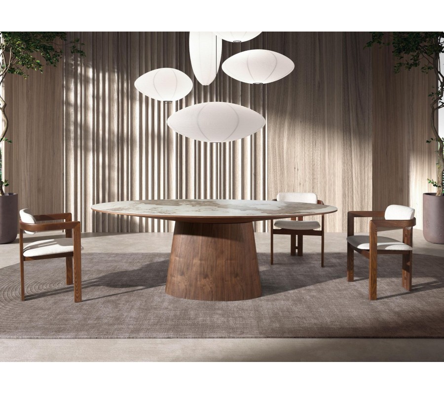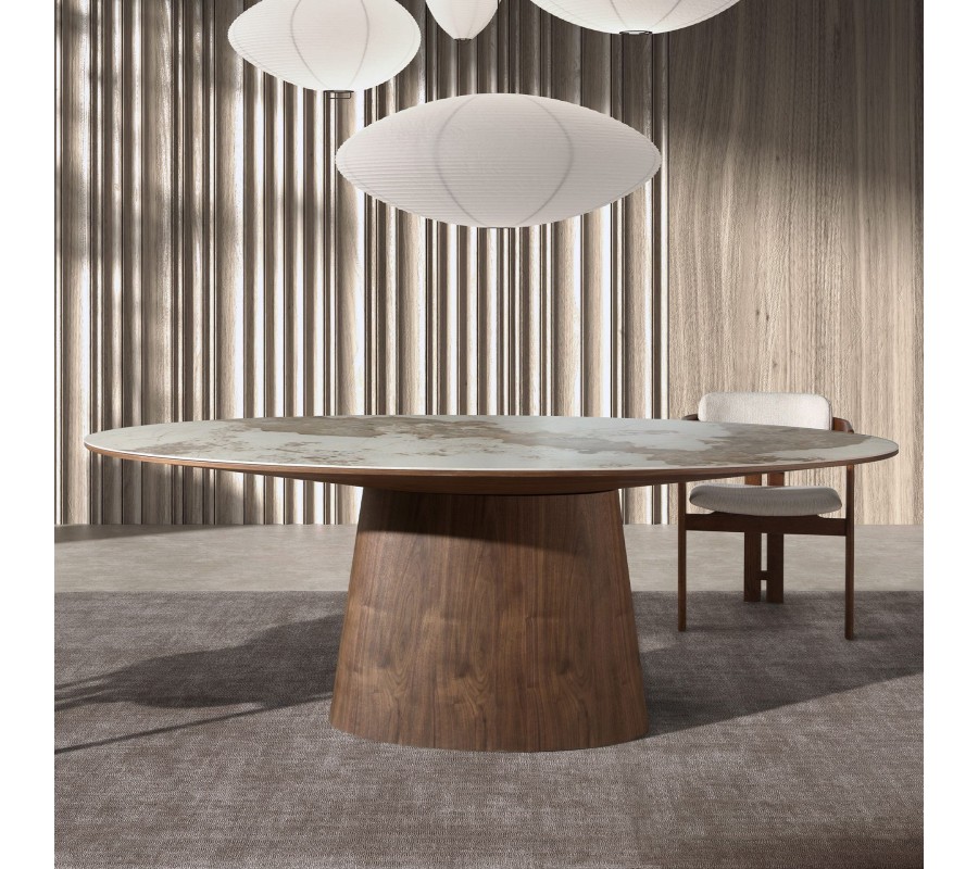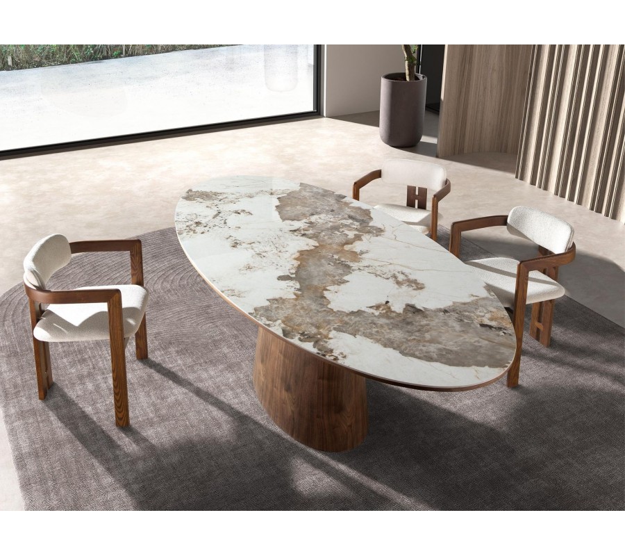 Jedálenský stôl Vita Naturale je výrazným prvkom, ktorý kombinuje eleganciu porcelánového mramoru s prírodným charakterom dreva. Jeho oválna silueta pôsobí vyvážene a harmonicky, pričom ponúka komfortné usadenie pre väčší počet osôb. Už na prvý pohľad zaujme spojenie luxusného materiálu s nadčasovým tvarovaním.