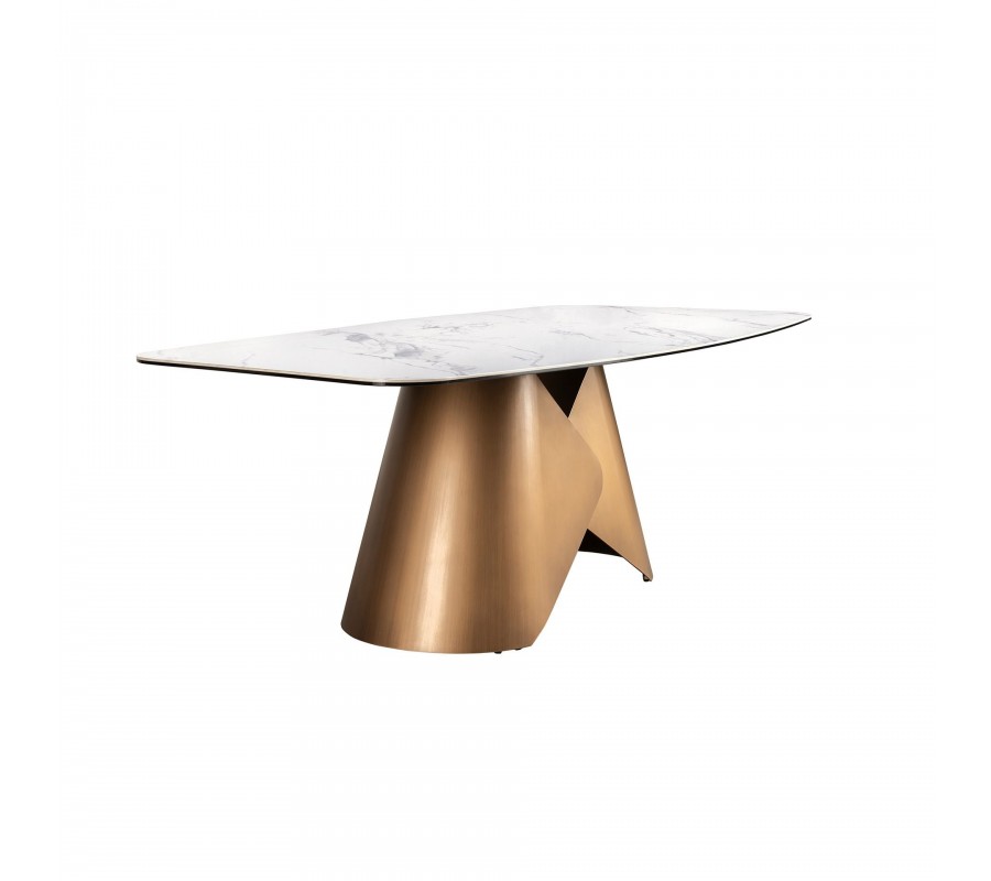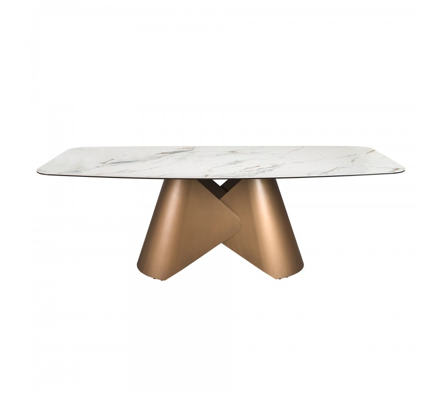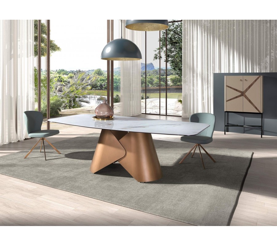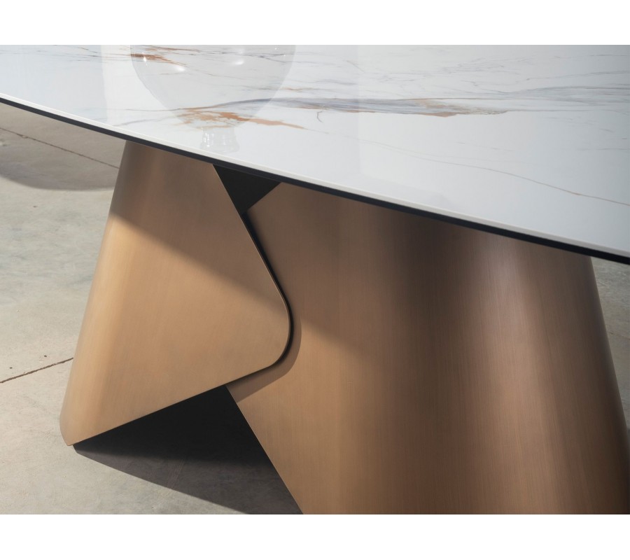 Dominantným prvkom celého stola je jeho robustná noha atypického tvaru, je vyrobená z nehrdzavejúcej ocele v bronzovej farbe s jemným leskom. Noha zabezpečuje maximálnu stabilitu, zatiaľ čo pôsobí ako sochársky prvok, čo zvyšuje jej estetickú hodnotou. Kombinácia lesklého porcelánu s mramorovou kresbou a bronzovou farbou podčiarkuje glamour charakter stola. Je navrhnutý tak, aby poskytol dostatok priestoru až pre desať osôb, čím sa stáva ideálnym miestom pre rodinné večere, a iné spoločenské stretnutia.