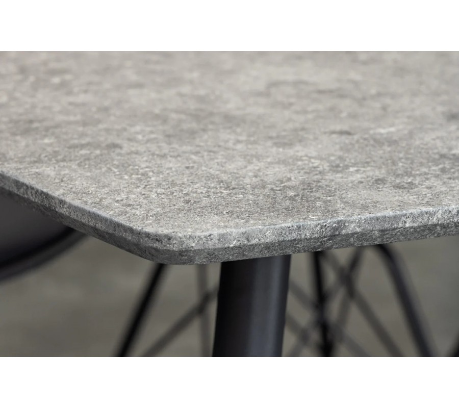 Vrchná doska má sivý kamenný vzhľad s mramorovou kresbou, ktorý dodáva stolu moderný a sofistikovaný charakter. Povrch pôsobí vizuálne pokojne a decentne, pričom oblé rohy zjemňujú celkový tvar stola a prispievajú k harmonickému vzhľadu aj bezpečnému používaniu v každodennom režime.