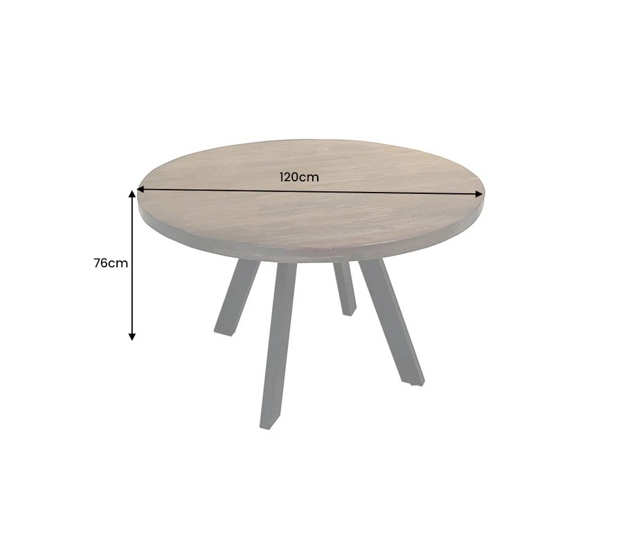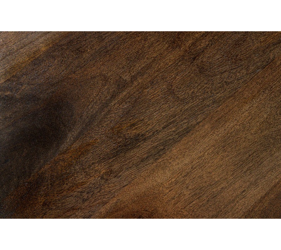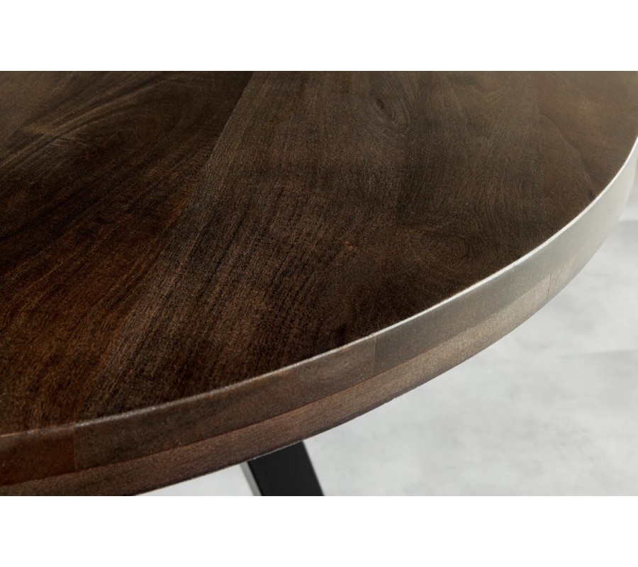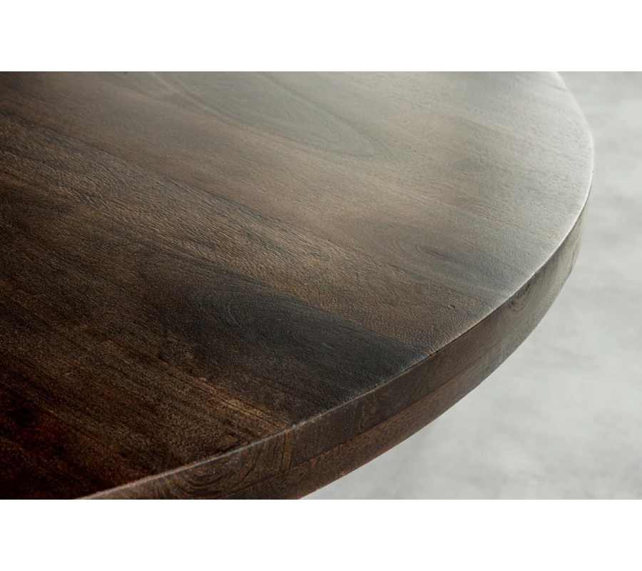 Vrchná doska je vyrobená z masívneho mangového dreva v hnedom taupe odtieni s výraznou a prirodzenou štruktúrou letokruhov. Povrch pôsobí autenticky, teplo a vizuálne bohato, pričom každý kus má jedinečnú kresbu dreva. Okrúhly tvar dosky podporuje príjemnú atmosféru pri stolovaní a umožňuje prirodzený kontakt medzi všetkými sediacimi.