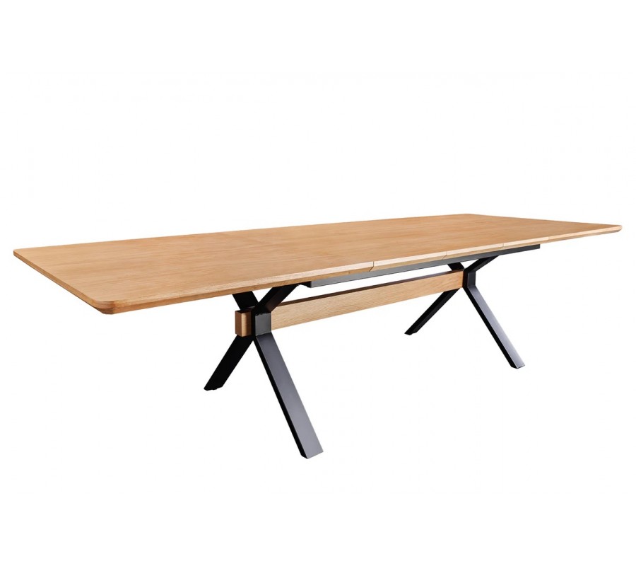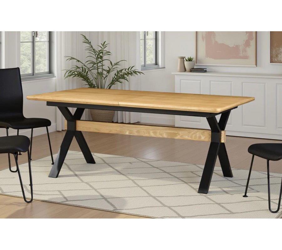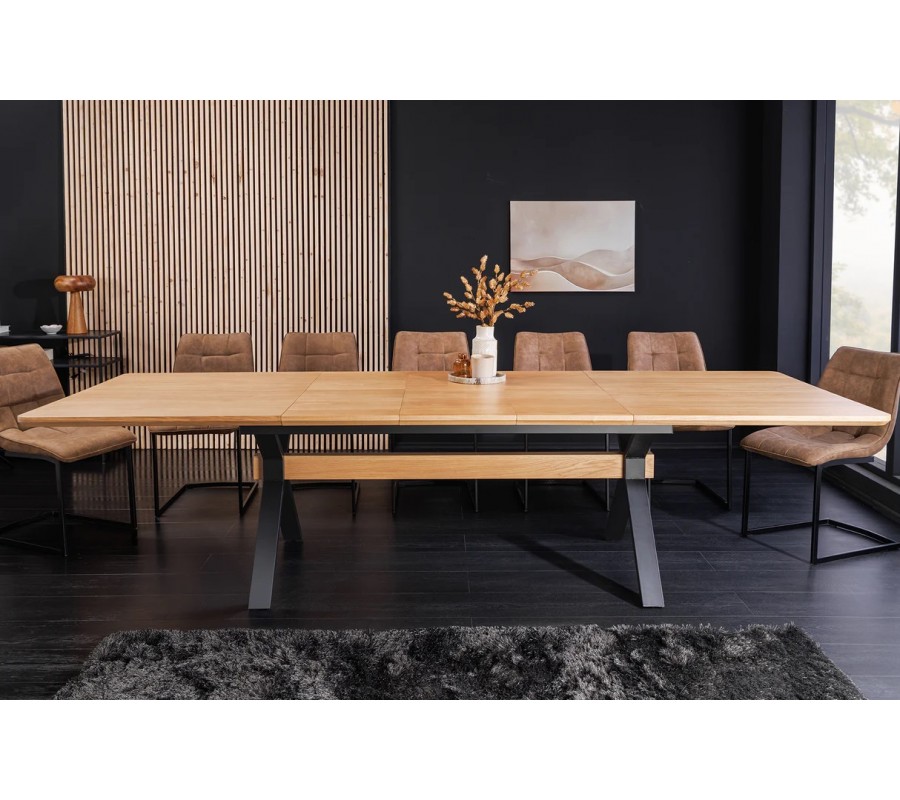Industriálny veľký obdĺžnikový rozkladací jedálenský stôl Gerant so severským nádychom je výrazným dizajnovým kusom, ktorý spája prirodzenú krásu dreva s modernou, architektonicky pôsobiacou konštrukciou.