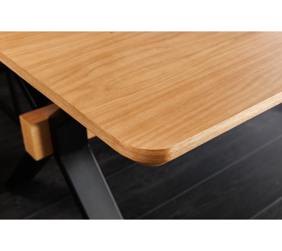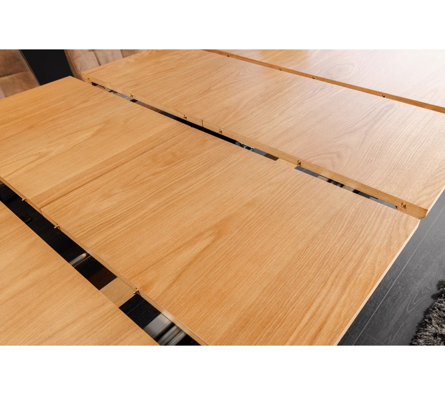 Vrchná doska je dyhovaná dubovým drevom s výraznou štruktúrou letokruhov, ktorá dodáva stolu autentický, prirodzený a teplý výraz. Povrch pôsobí elegantne a zároveň odolne, pričom oblé rohy zjemňujú celkovú siluetu stola a prispievajú k vizuálnej harmónii aj bezpečnosti pri používaní. Konštrukčne sa stôl skladá z piatich dosiek – dve postranné tvoria hlavné pevné časti a tri užšie stredové dosky slúžia na postupné predlžovanie stola, vďaka čomu je rozkladanie plynulé a variabilné.