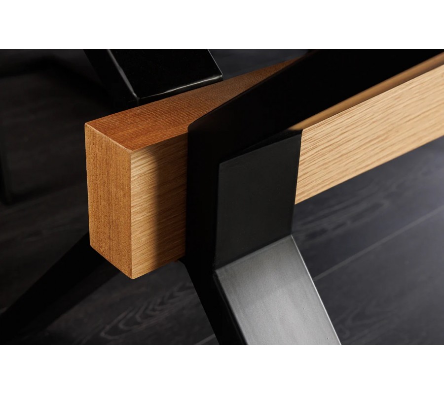 Podnož tvorí výrazná čierna kovová konštrukcia, pričom nožičky sú vyosené smerom von do krížového tvaru. Tento prvok dodáva stolu typický industriálny vzhľad a zároveň zabezpečuje vysokú stabilitu aj pri maximálnom rozložení. Medzi nožičkami sa nachádza spojovacia drevená tyč, ktorá spevňuje konštrukciu a vizuálne prepája kovové a drevené prvky do jednotného celku.