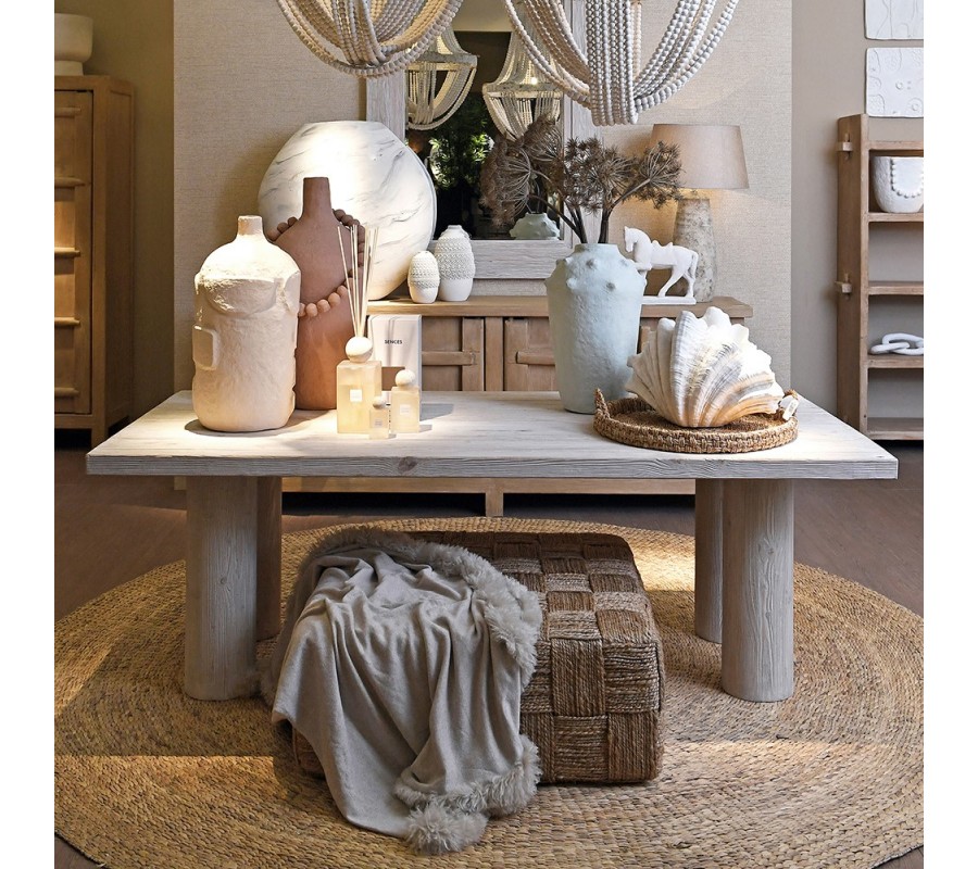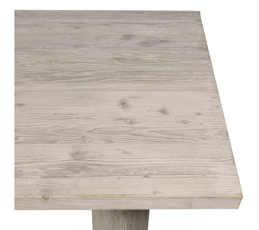 Minimalistickú geometrickú siluetu oživuje prevedenie z recyklovaného masívneho dreva. Tento materiál je ekologický a zároveň dodáva každému kusu unikátnu štruktúru. Lakovanie v svetlej krémovej farbe zdôrazňuje kresbu letokruhov a miestami odhaľuje naturálne odtiene dreva. Do jedálne prinesie výrazný prírodný prvok.