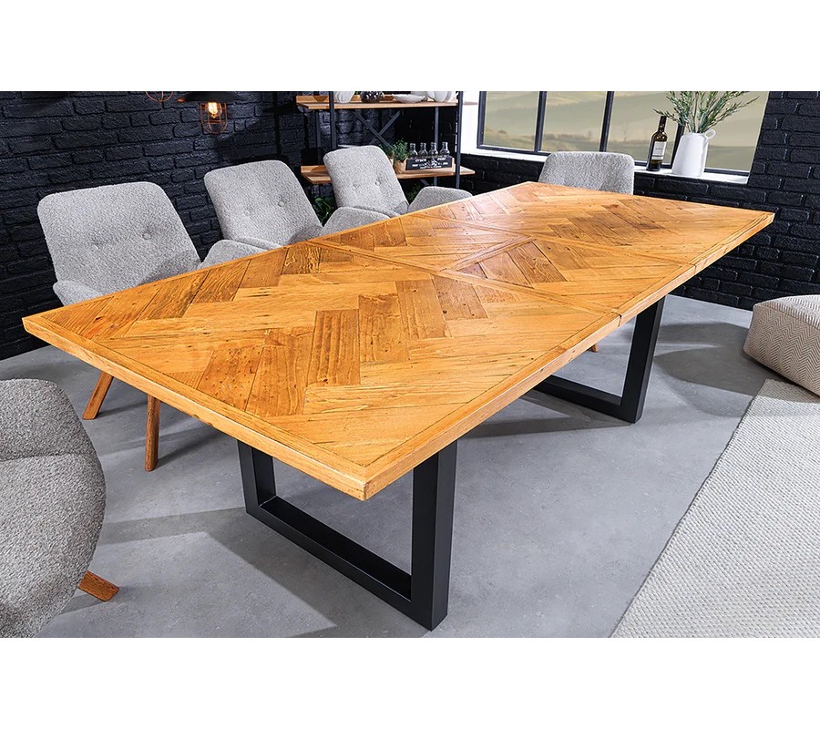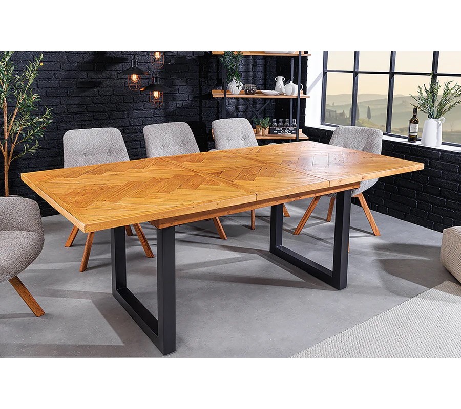 Industriálny obdĺžnikový rozkladací jedálenský stôl Perry je výrazným dizajnovým prvkom, ktorý spája autentický vzhľad recyklovaného dreva s pevnou kovovou konštrukciou. Vďaka kombinácii hnedej drevenej dosky s parketovým vzorom a čiernych kovových nôh pôsobí robustne, industriálne a zároveň nadčasovo.