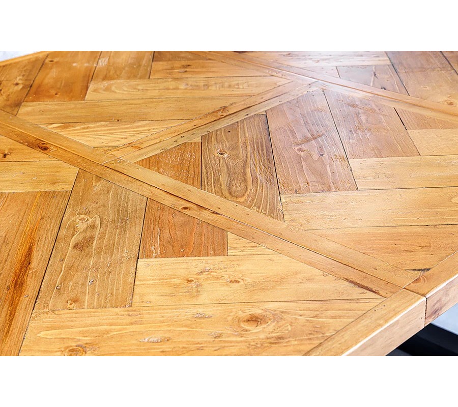 Vrchná doska je vyrobená z recyklovaného dreva v hnedej farbe s výraznou kresbou letokruhov. Povrch je vyskladaný do parketového vzoru vo vzore rybej kosti, ktorý dodáva stolu hĺbku, originalitu a remeselný charakter. Lakovaný povrch chráni drevo pri každodennom používaní a zároveň zvýrazňuje jeho prirodzenú štruktúru a teplý tón.