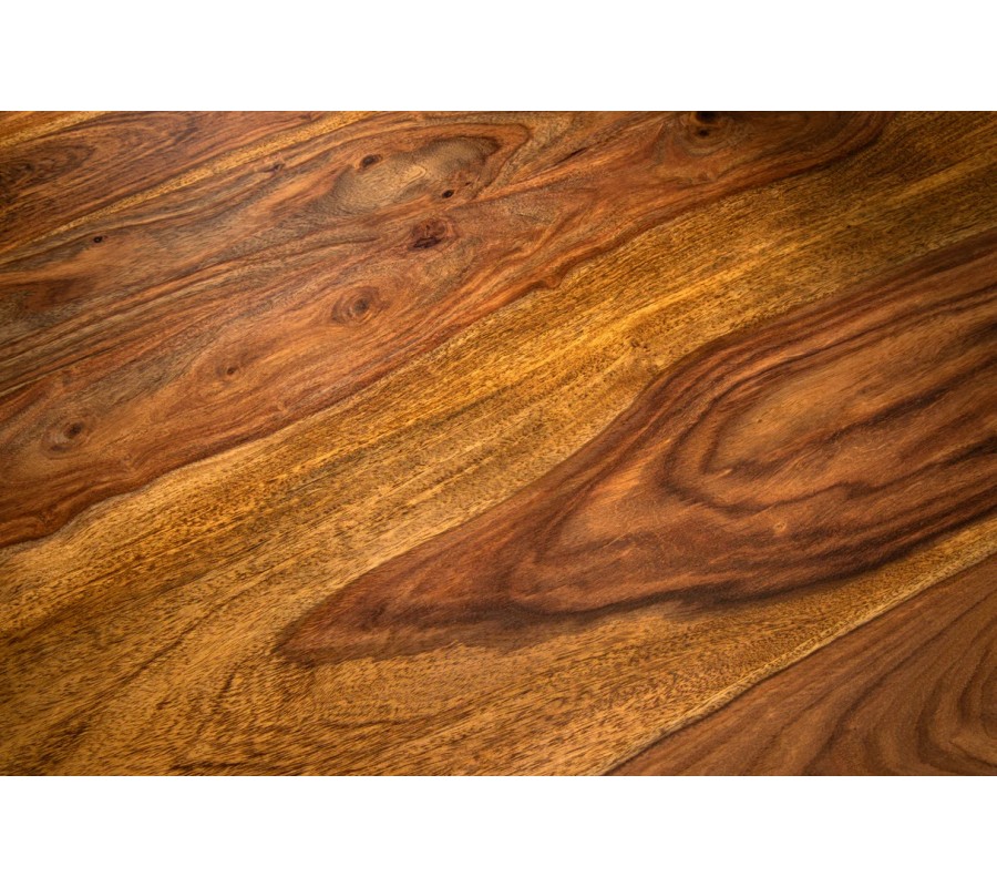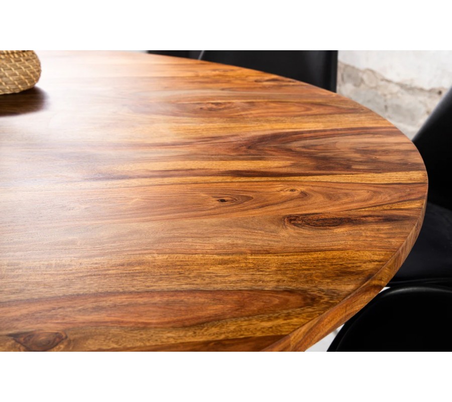 Stôl je vyrobený z kvalitného sheeshamového dreva v teplom hnedom odtieni, známeho svojou tvrdosťou, odolnosťou a jedinečnou kresbou. Okrúhla stolová doska je zložená z viacerých drevených segmentov, vďaka čomu vyniká bohatá štruktúra letokruhov a prirodzená kresba dreva – každý kus je originál. Povrch je lakovaný, čo zvýrazňuje farebný tón dreva a zároveň chráni stôl pri každodennom používaní.