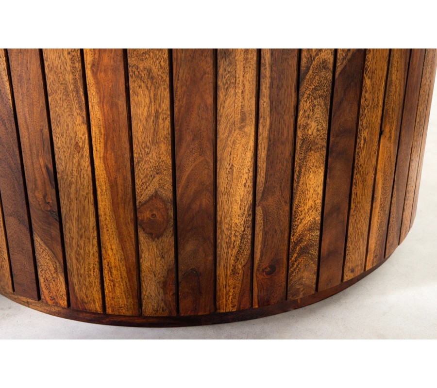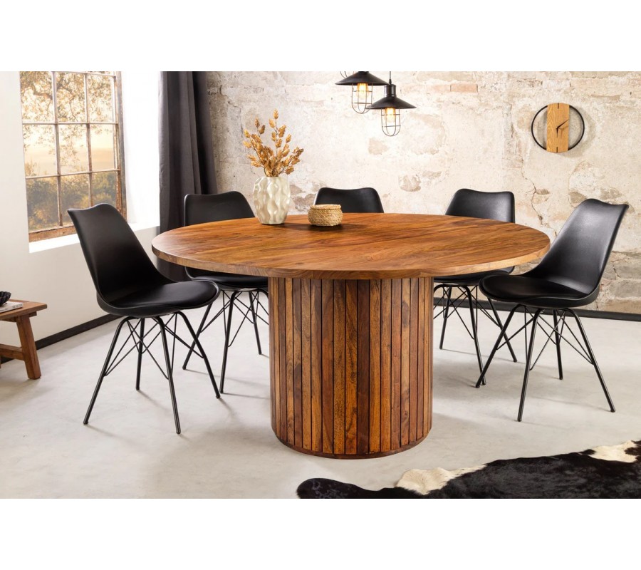 Art deco geometrický okrúhly jedálenský stôl Gire je výrazný masívny kus nábytku, ktorý spája nadčasový dizajn s prirodzenou krásou dreva. Je vyrobený z kvalitného sheeshamového dreva v teplom hnedom odtieni, ktoré vyniká svojou tvrdosťou, odolnosťou a jedinečnou kresbou. Stôl je zložený z viacerých dosiek, vďaka čomu krásne vyniká výrazná štruktúra letokruhov a prirodzené farebné prechody dreva, pričom každý stôl je originál. Povrch je lakovaný, čo zvyšuje jeho odolnosť a zároveň zvýrazňuje prirodzený charakter materiálu.