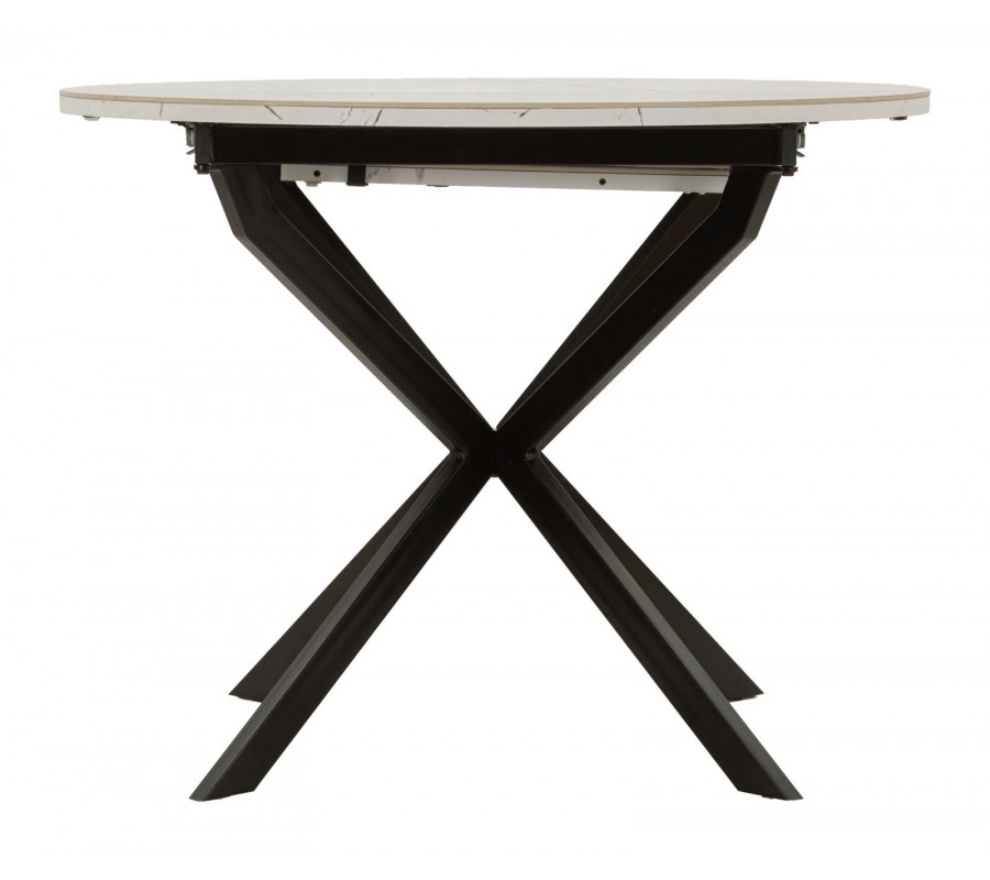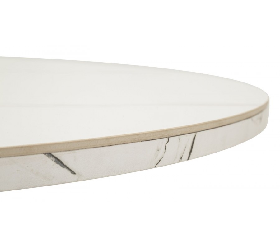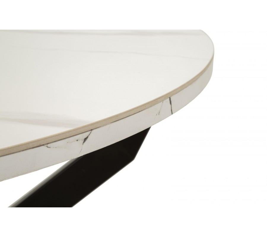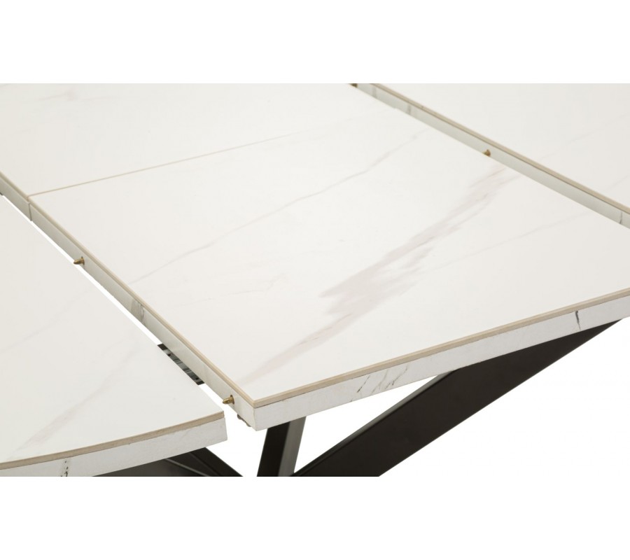 Vrchná doska je vyrobená z keramiky, ktorá poskytuje odolný a na údržbu nenáročný povrch. Mliečnu bielu farbu dopĺňa elegantné sivé mramorové žilkovanie. Podstava je vyrobená z kovu v čiernej farbe, ktorý výborne ladí s mramorom a pôsobí minimalisticky. Štyri nožičky majú hranatý profil a sú v strede prekrížené. Vytvárajú odľahčenú vzdušnú siluetu a zároveň poskytujú dostatok miesta pri sedení.