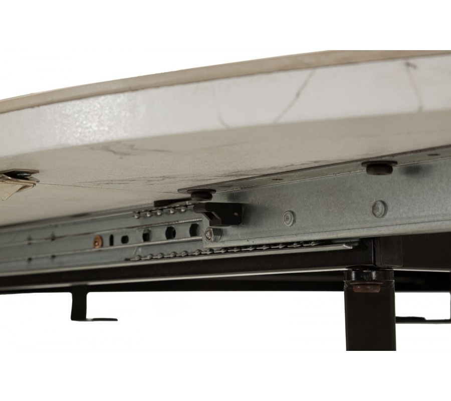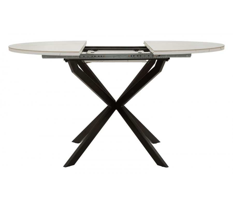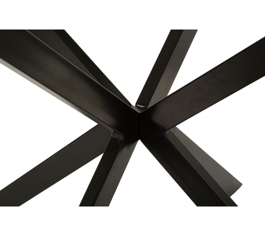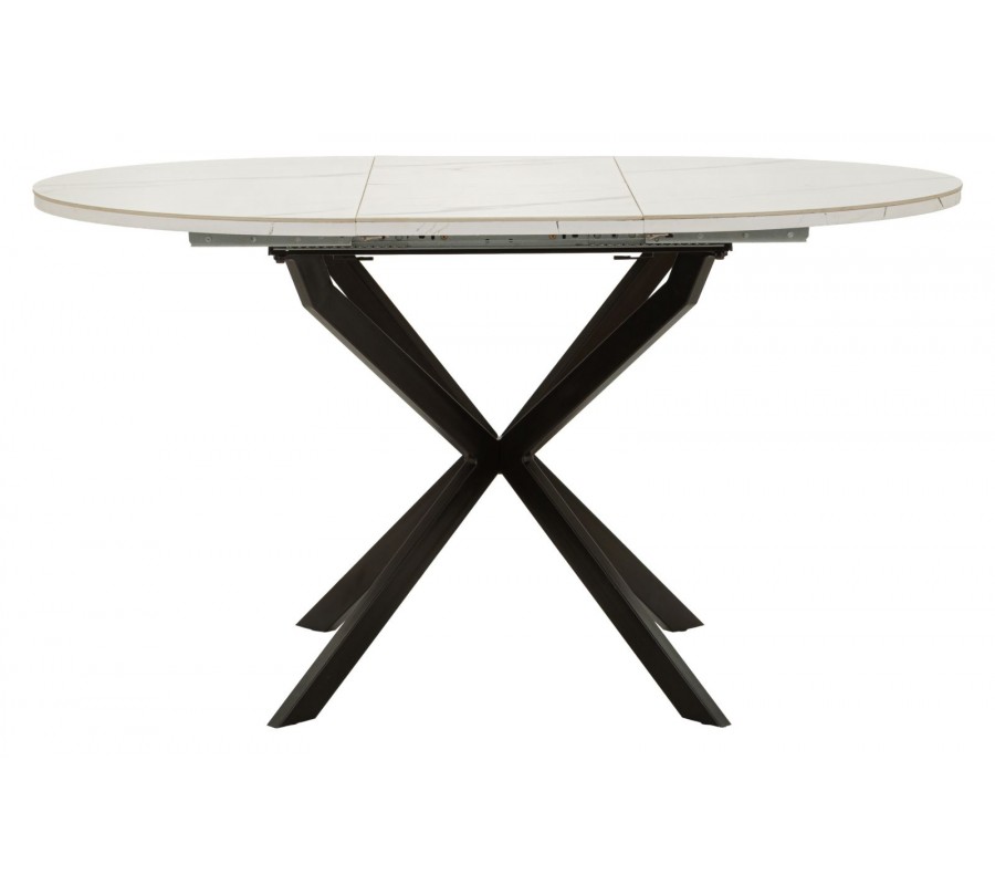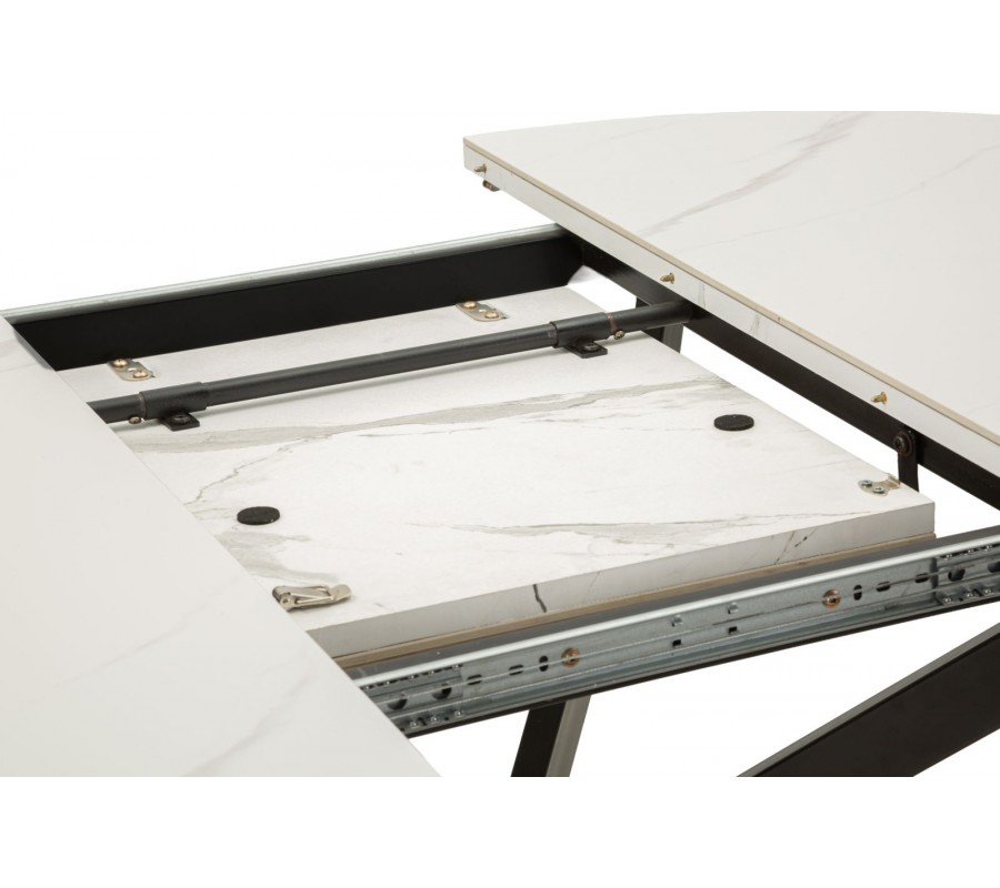Vrchná doska je vyrobená z keramiky, ktorá poskytuje odolný a na údržbu nenáročný povrch. Mliečnu bielu farbu dopĺňa elegantné sivé mramorové žilkovanie. Podstava je vyrobená z kovu v čiernej farbe, ktorý výborne ladí s mramorom a pôsobí minimalisticky. Štyri nožičky majú hranatý profil a sú v strede prekrížené. Vytvárajú odľahčenú vzdušnú siluetu a zároveň poskytujú dostatok miesta pri sedení.