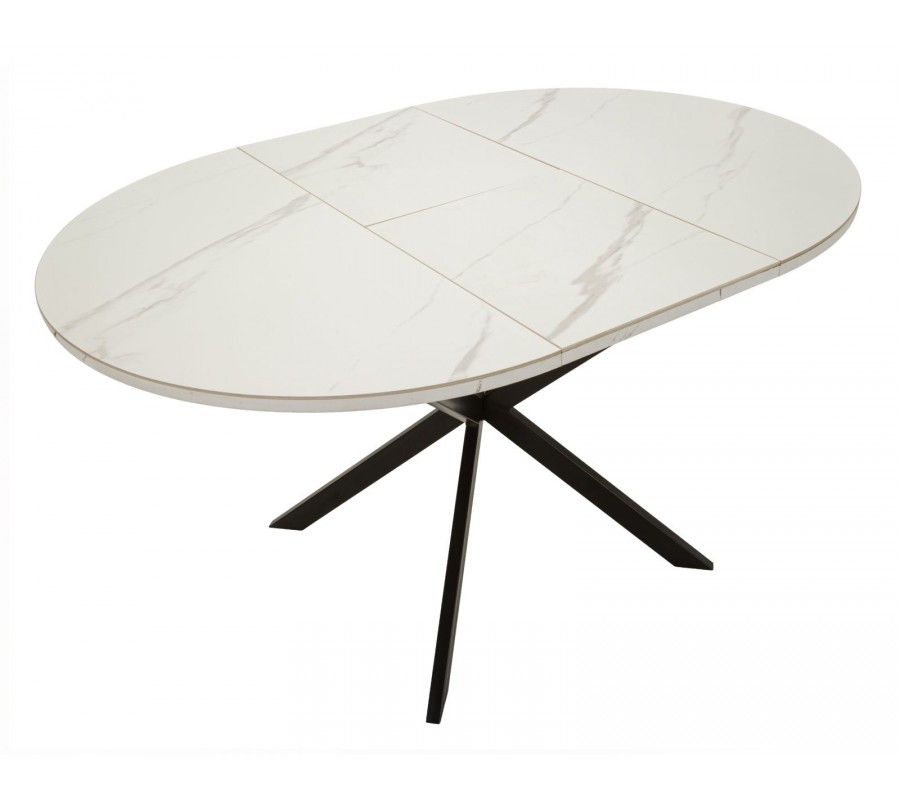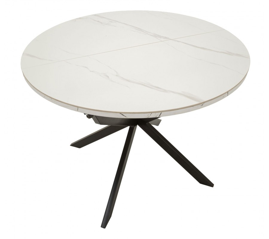 Moderný mramorový okrúhly rozkladací jedálenský stôl Tarro s bielou doskou so sivou kresbou a čiernou podstavou 100-140 cm