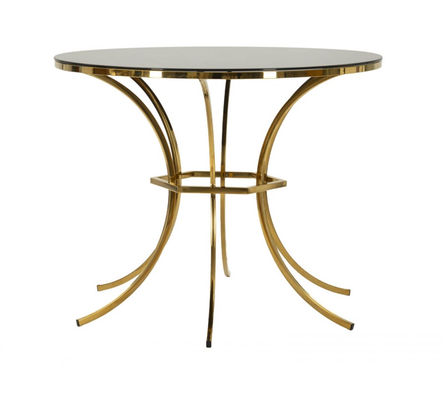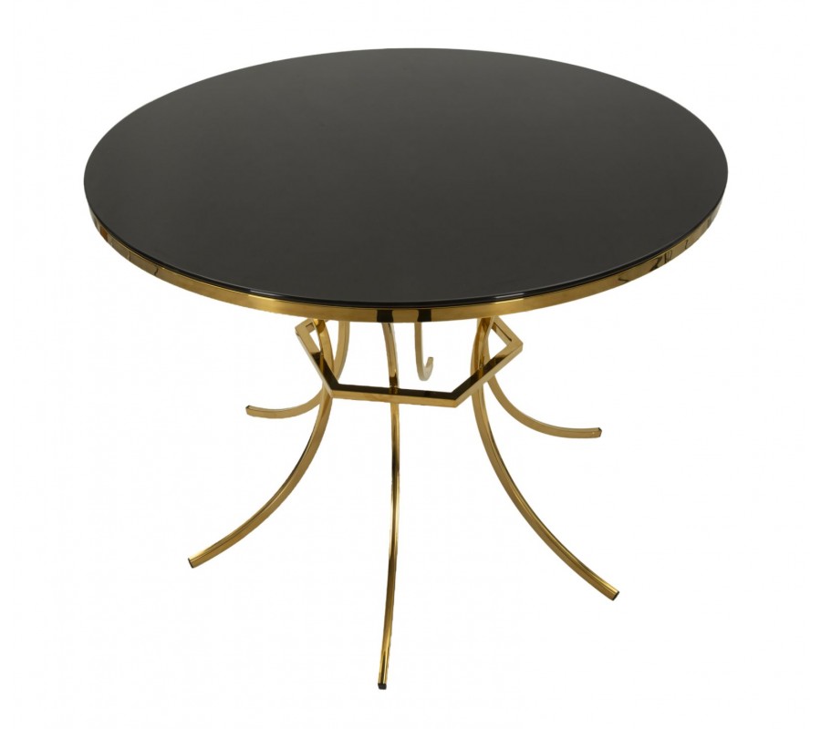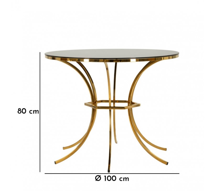 Stôl má okrúhlu vrchnú dosku vyrobenú zo skla v čiernej farbe. S priemerom 100 cm poskytne stolovacie miesto pre štyri osoby. Je zasadená v zlatom kovom ráme, ktorý ju lemuje po obvode. Podstava dodáva nábytku výrazný dizajnový charakter s dotykom estetiky art deco štýlu. Dominuje jej pravidelnosť a geometrické tvary. Šesť nožičiek má štíhly štvorhranný profil a sú prehnuté do pravidelného poloblúka. V strede výšky sa nachádza šesťuholníkový spojovací prvok v rovnakom prevedení a každá nožička je upevnená z vnútra k stredu jednej z jeho strán.