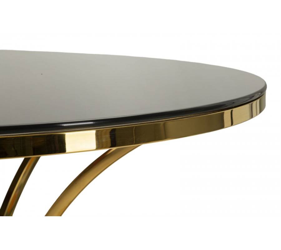 Zaoblené línie pôsobia elegantným dojmom a štíhla silueta je vzdušná a odľahčená. Vysoký lesk čierneho skla sa výborne prepája s metalickou zlatou kovovou konštrukciu v sofistikovanej kompozícii. Vďaka odrazenému svetlu tak stôl pomôže aj napriek tmavším odtieňom priestor presvetliť a prinesie do neho luxusný žiarivý centrálny prvok.