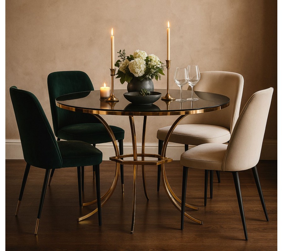 Dizajnový glamour okrúhly jedálenský stôl Hailey s čiernou sklenenou doskou a zlatou kovovou podstavou 100 cm
