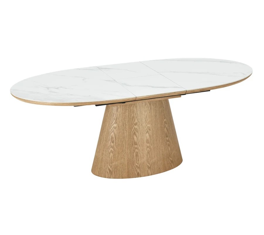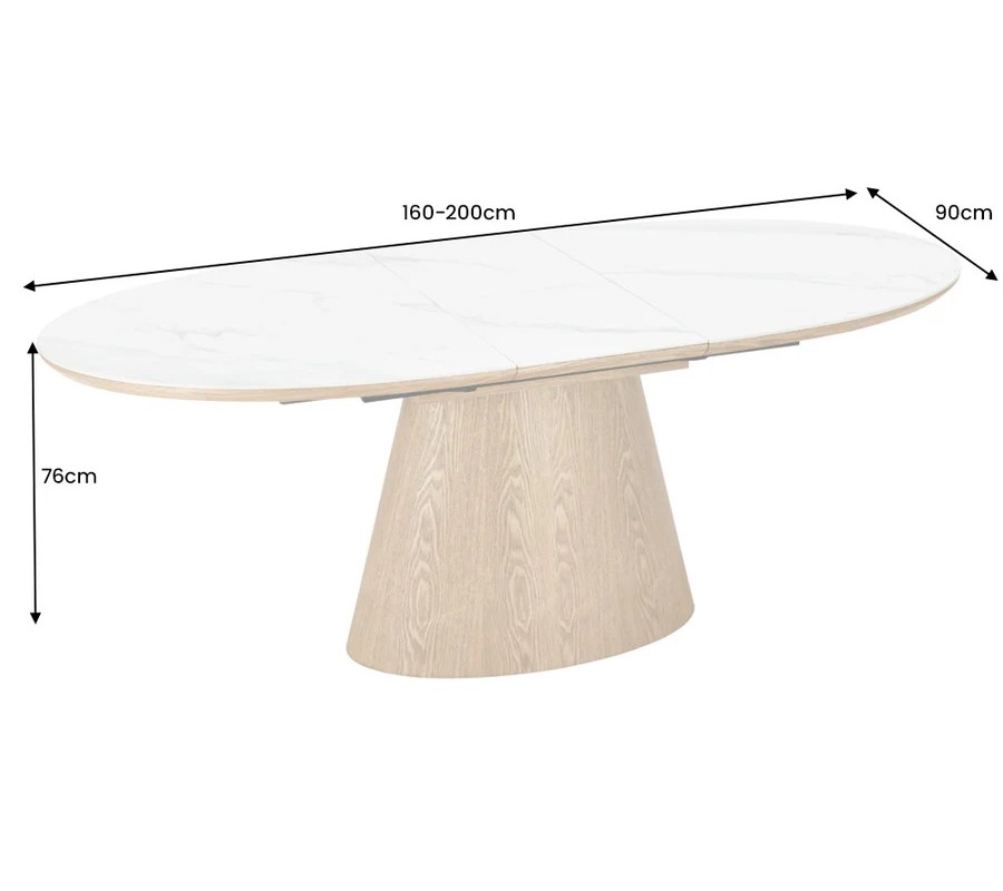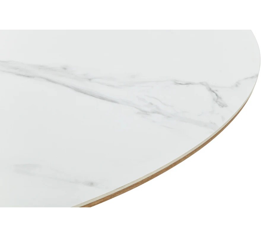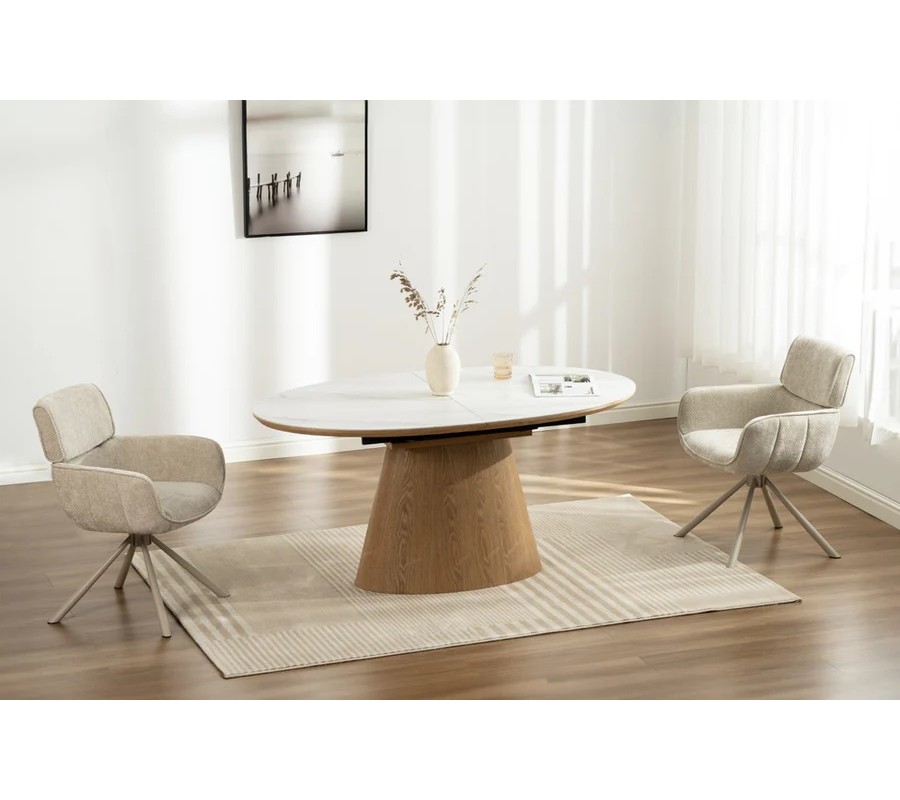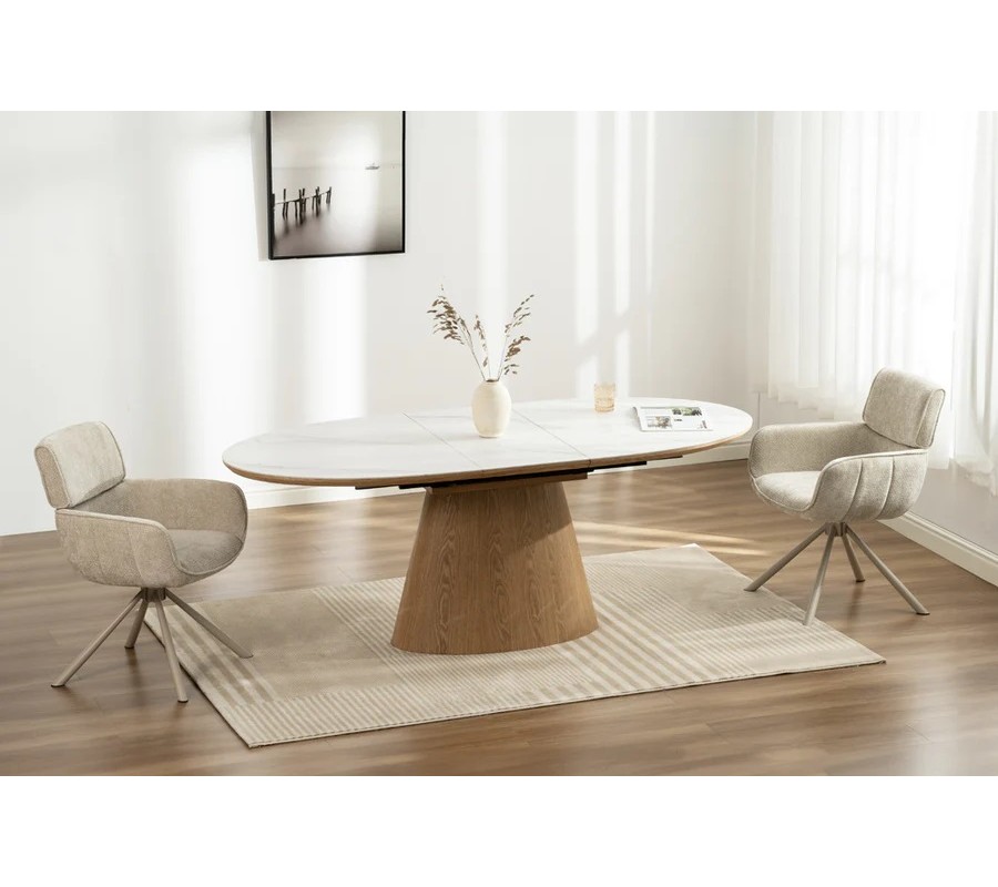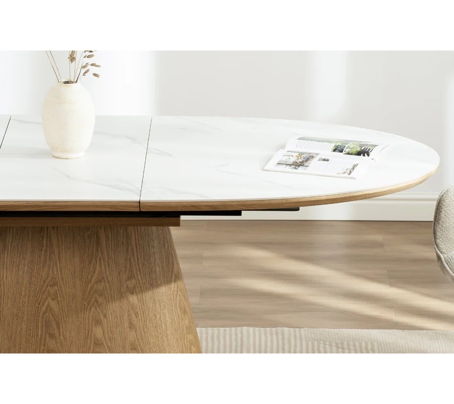 Vrchná doska je vyrobená z keramiky s mramorovým vzhľadom v bielej farbe so sivými žilkami, ktoré pôsobia jemne, elegantne a veľmi realisticky. Keramický povrch je odolný, praktický na každodenné používanie a zároveň vizuálne veľmi čistý. Oválny tvar dosky podporuje plynulosť priestoru a príjemnú atmosféru pri stolovaní.