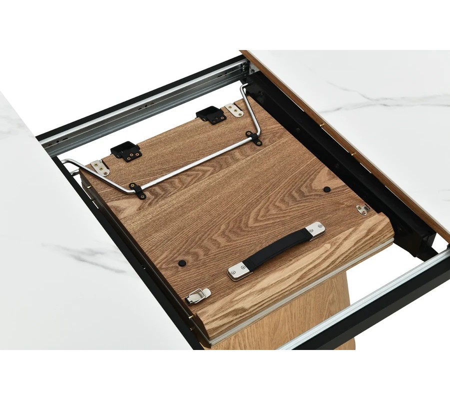 Moderný oválny rozkladací jedálenský stôl Marmol Ligna je elegantným a funkčným kúskom, ktorý spája luxusný mramorový vzhľad s teplým prírodným charakterom dreva. Vďaka harmonickému dizajnu a nadčasovým materiálom sa stáva výraznou dominantou modernej jedálne.