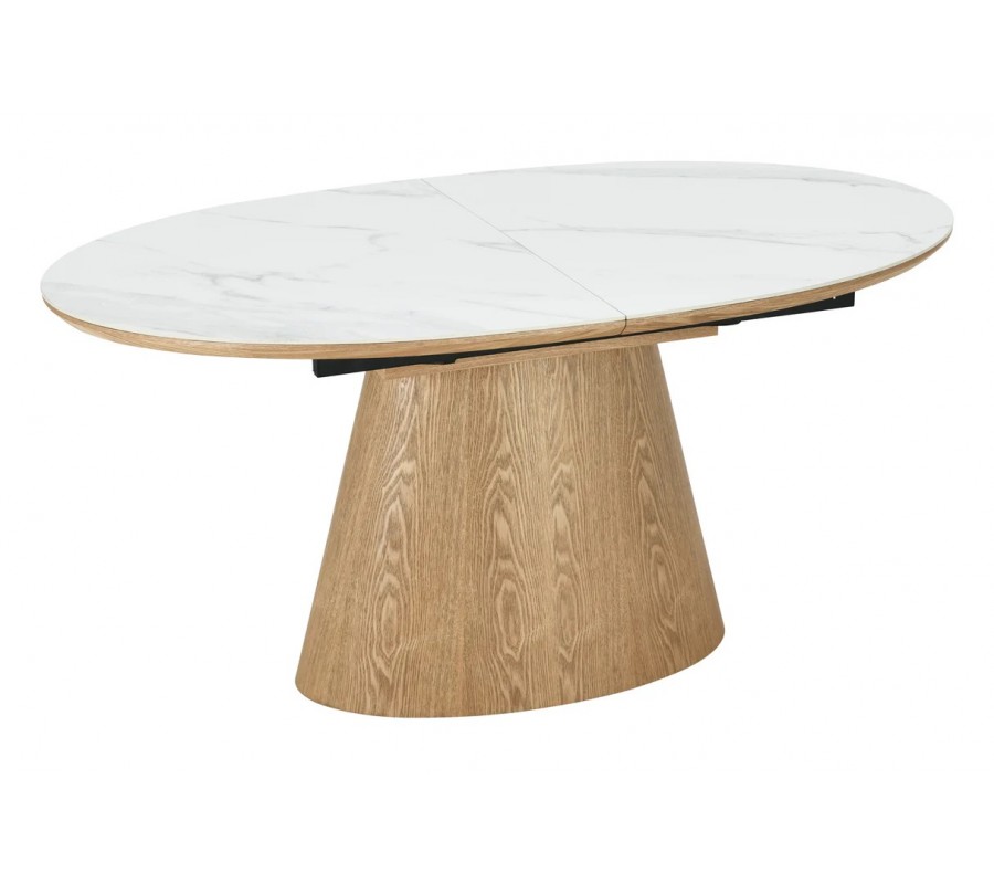Vrchná doska je vyrobená z keramiky s mramorovým vzhľadom v bielej farbe so sivými žilkami, ktoré pôsobia jemne, elegantne a veľmi realisticky. Keramický povrch je odolný, praktický na každodenné používanie a zároveň vizuálne veľmi čistý. Oválny tvar dosky podporuje plynulosť priestoru a príjemnú atmosféru pri stolovaní.