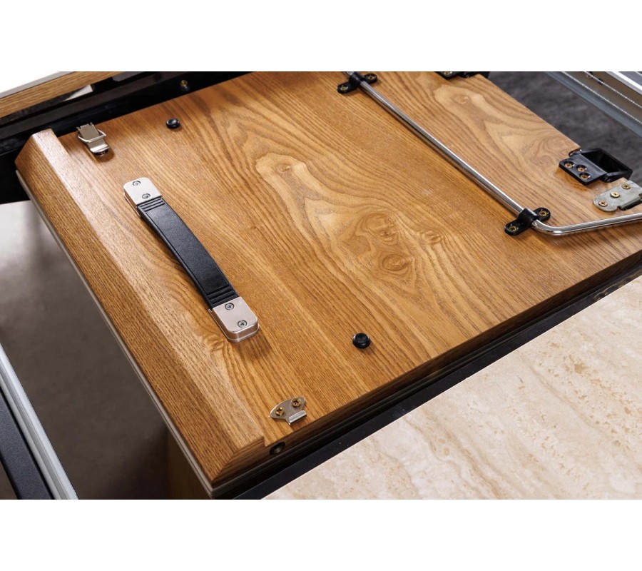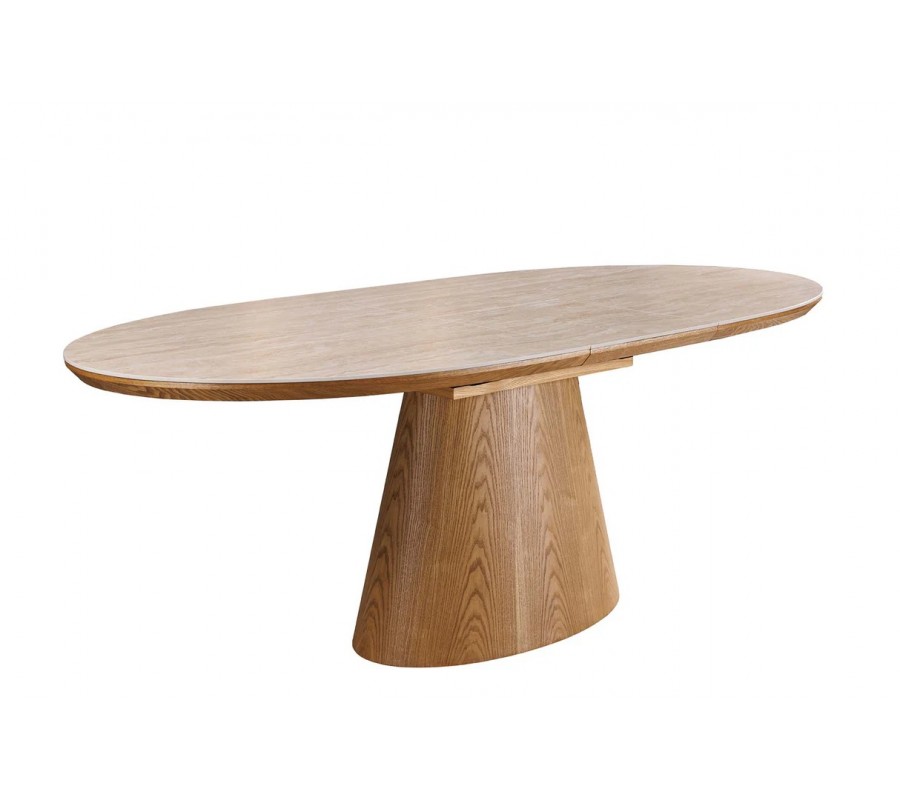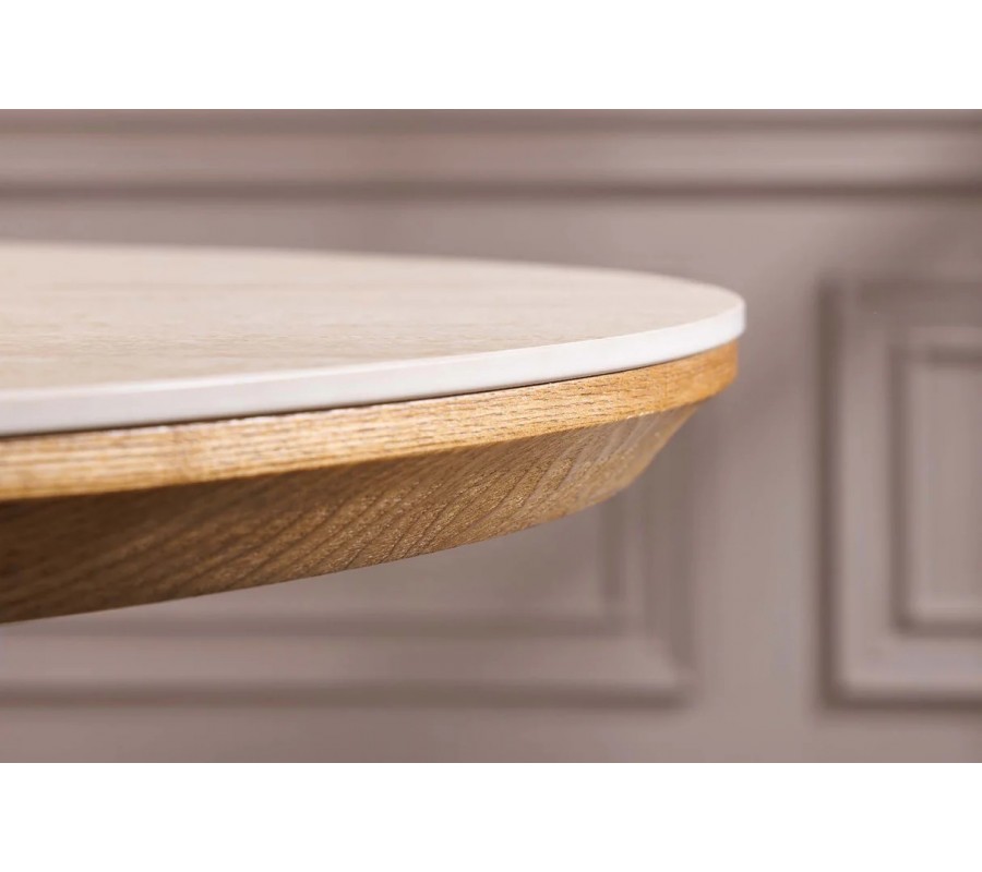 Vrchná doska je vyrobená z keramiky s travertínovým hnedým vzhľadom, charakteristickým jemnou kresbou a plynulými farebnými prechodmi. Keramický povrch je odolný, praktický a ľahko udržiavateľný, vďaka čomu je vhodný na každodenné stolovanie. Oválny tvar dosky pôsobí mäkko, elegantne a podporuje príjemnú atmosféru pri spoločnom stolovaní.