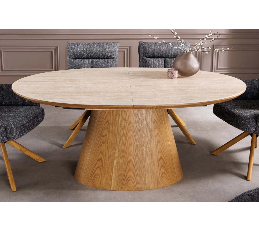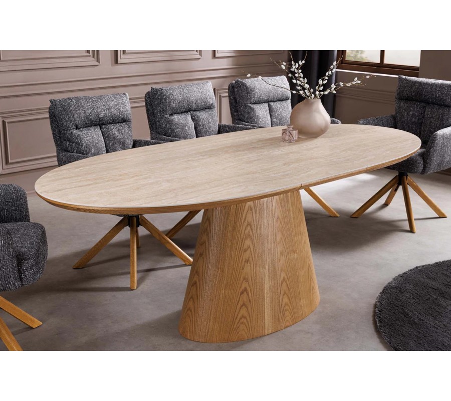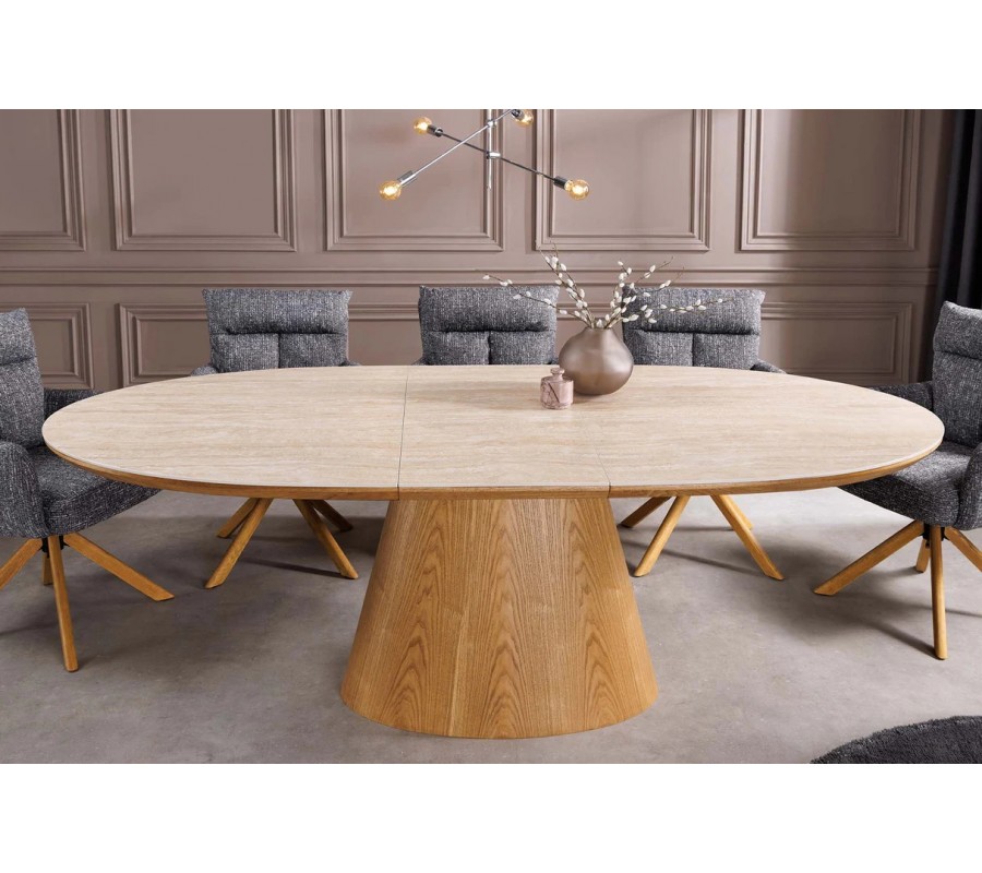 Moderný art deco oválny rozkladací jedálenský stôl Marmol Lignia v travertínovom prevedení je elegantným a nadčasovým kusom, ktorý do interiéru vnáša charakter kameňa a teplo dreva. Jeho dizajn spája jemnú luxusnú estetiku s funkčnosťou vhodnou na každodenné používanie aj spoločenské príležitosti.