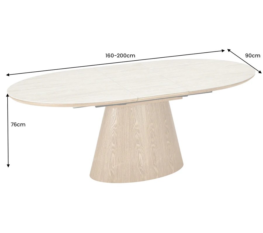 Stôl je rozkladací v rozsahu od 160 do 200 cm. V stredovej časti sa nachádza jedna vkladacia doska, ktorá slúži na jednoduché predĺženie stolovej plochy. V základnom rozmere 160 cm poskytuje pohodlné stolovanie pre 6 osôb, po rozložení na 200 cm ponúka komfortný priestor až pre 8 osôb, čo z neho robí ideálnu voľbu aj na rodinné oslavy či návštevy.