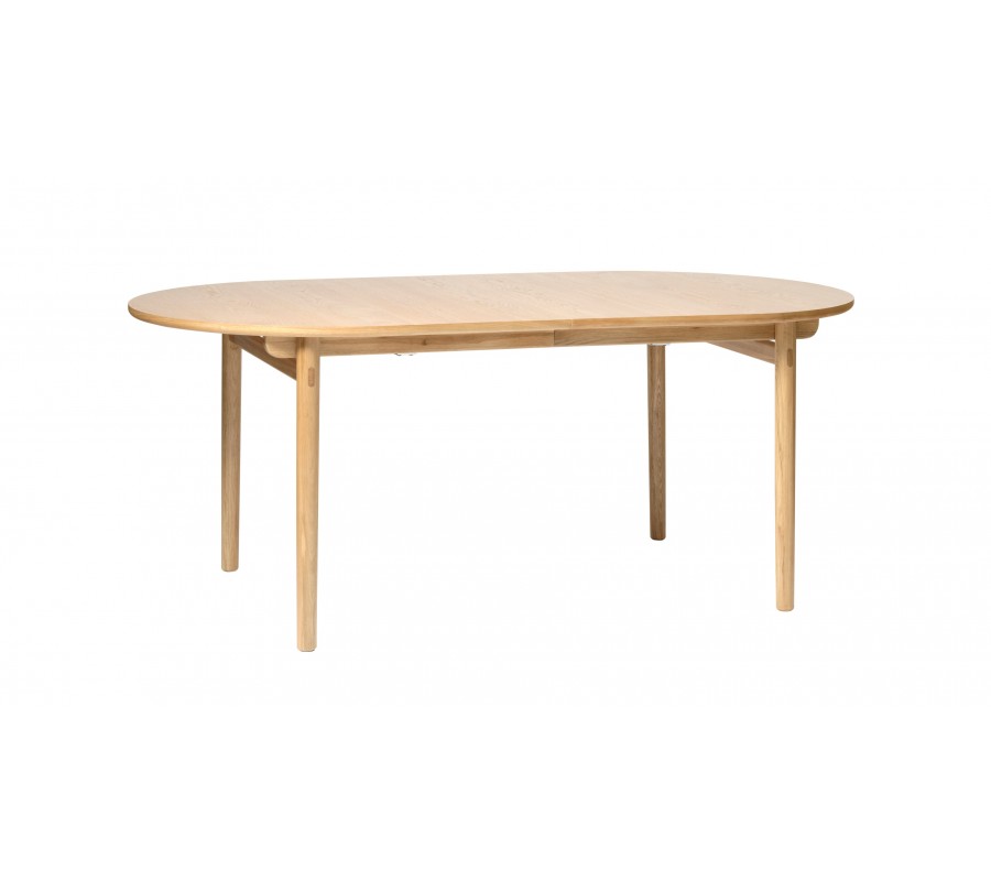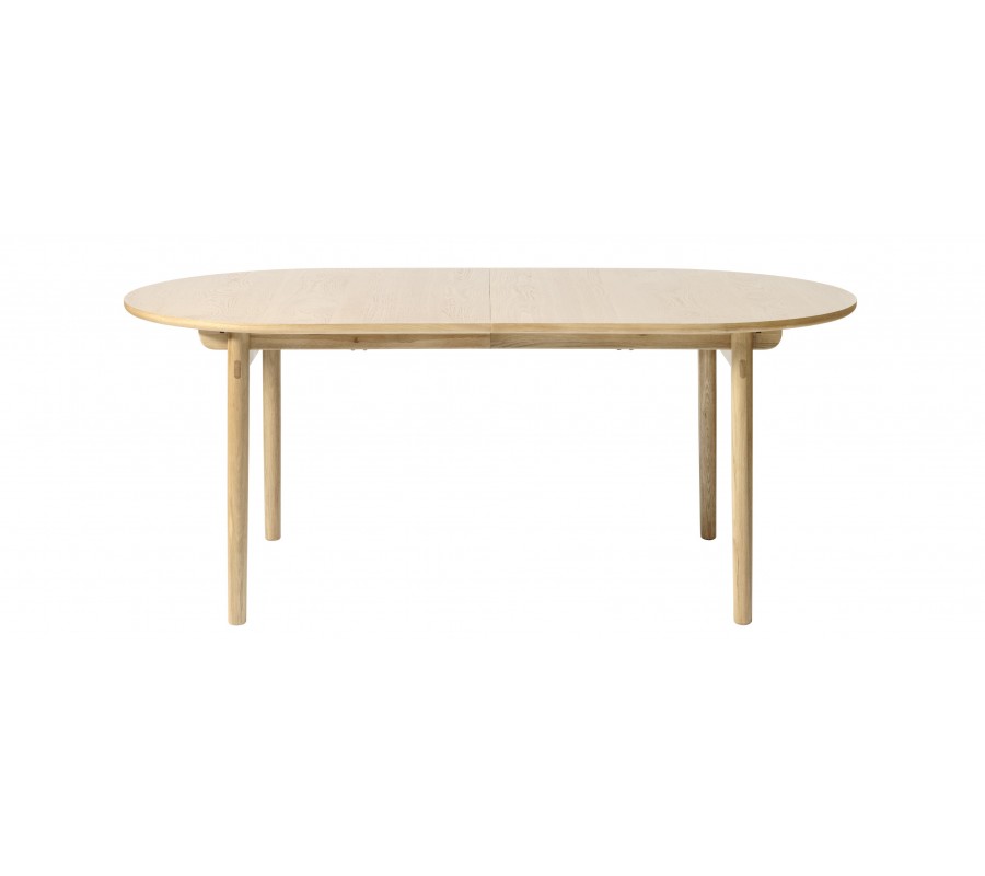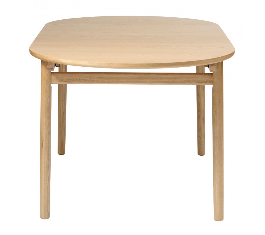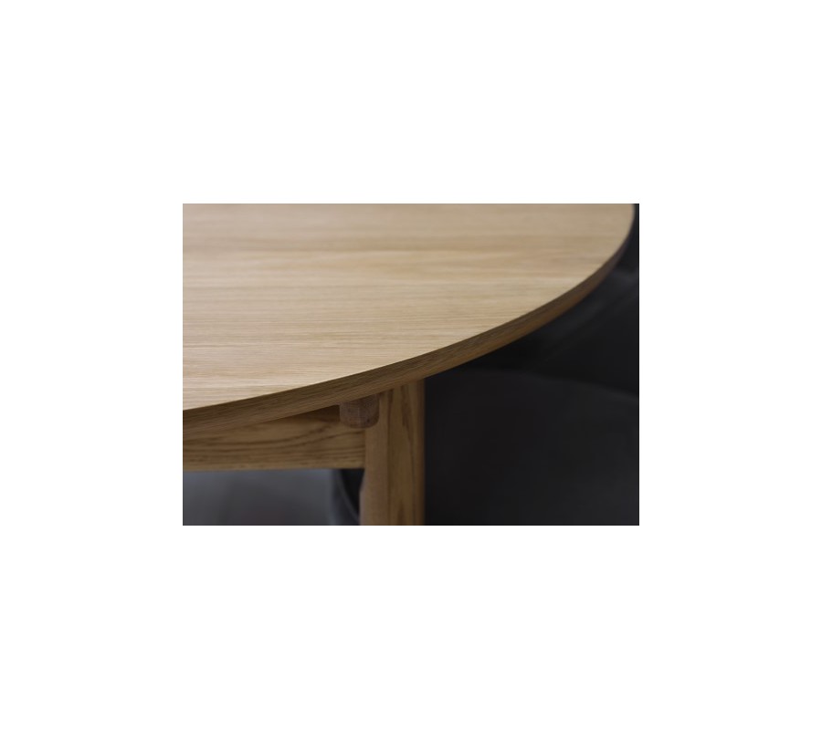 Jedálenský stôl má minimalistickú siluetu s čistými tvarmi a hladkými povrchmi, zatiaľ čo elegantné zaoblenia mu dodávajú jemný retro nádych, inšpirovaný škandinávskym dizajnom z polovice minulého storočia. Je vyrobený z kombinácie masívneho a dyhovaného dubového dreva. Prírodná svetlá hnedá farba a pravidelná kresba letokruhov mu dodávajú teplý a útulný výraz.