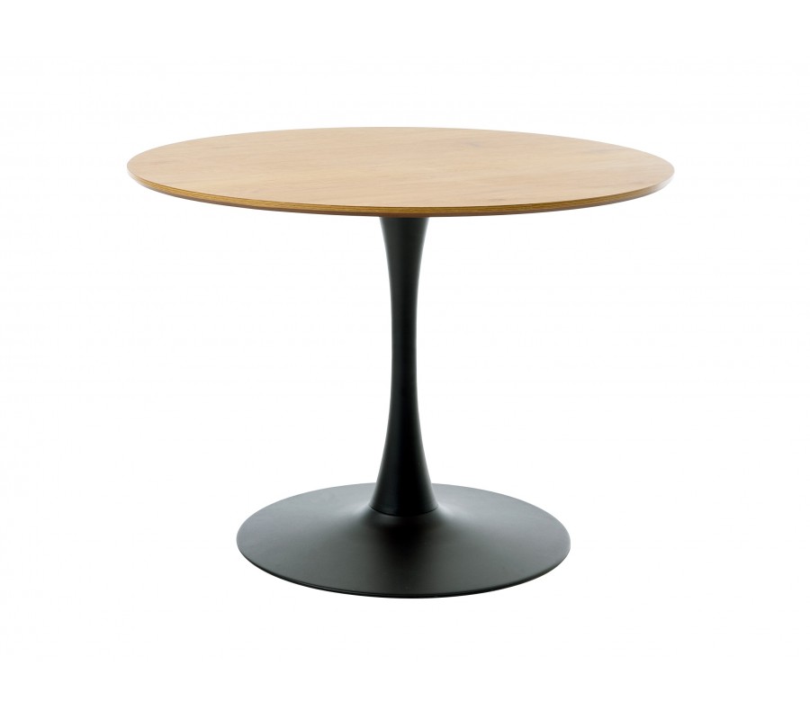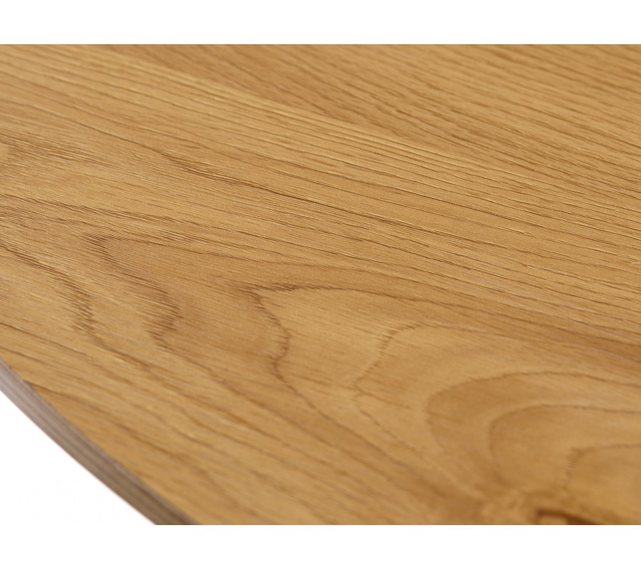 Stôl má okrúhlu vrchnú dosku v svetlej hnedej farbe s pravidelnou kresbou letokruhov. Dubové prevedenie pôsobí teplo, prírodne a harmonicky. Doska je vyrobená z kvalitnej melamínovej dyhy, ktorá je mimoriadne odolná voči oderu, teplu a vlhkosti, čo robí z tohto stola ideálny nábytok na každodenné používanie.