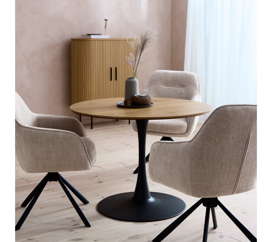 Jedálenský stôl Holstebro prinesie do vašej domácnosti moderný minimalizmus s nádychom industriálnej estetiky. S priemerom 100 cm je skvelým riešením do menších jedální, kuchýň či otvorených loftových priestorov. Poskytne miesto pre štyri osoby.