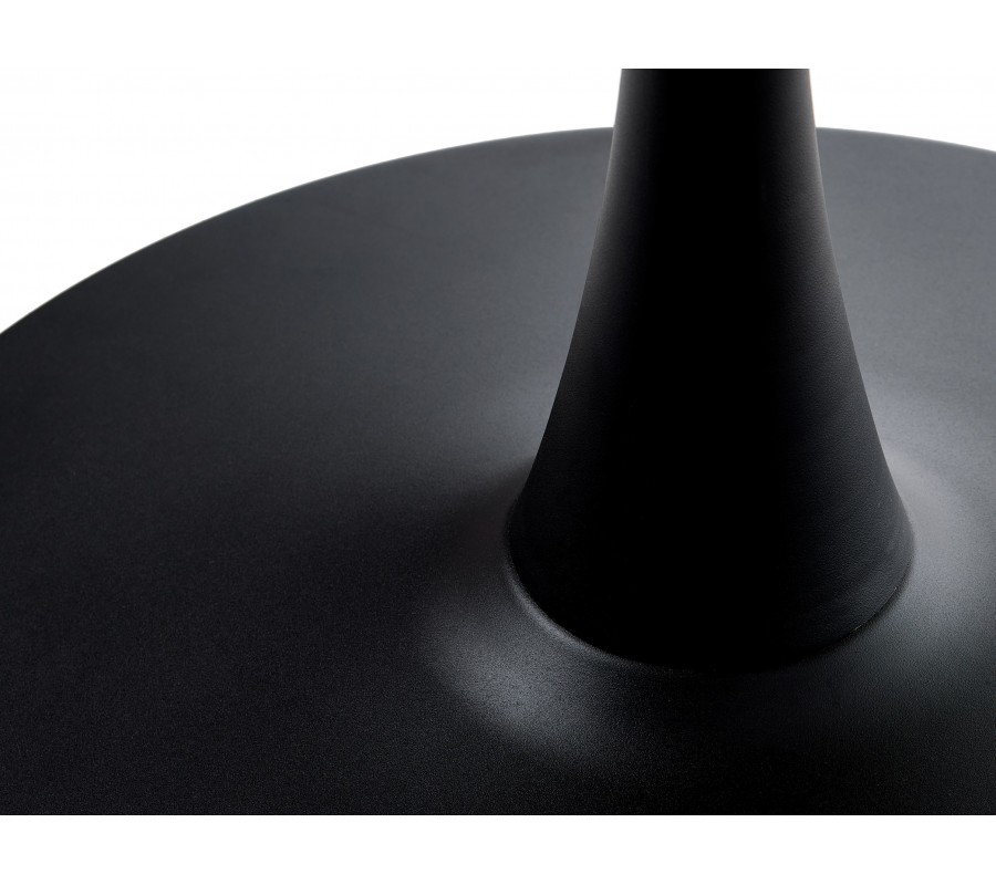 Stabilitu zabezpečuje kovová podstava v matnej čiernej farbe, ktorá štýlovo kontrastuje s prevedením vrchnej dosky. Jej valcovitý tvar je v strede jemne zúžený a smerom nadol plynulo prechádza do okrúhlej základne. Takéto riešenie je estetické a zároveň poskytuje dostatok priestoru na pohodlné sedenie.