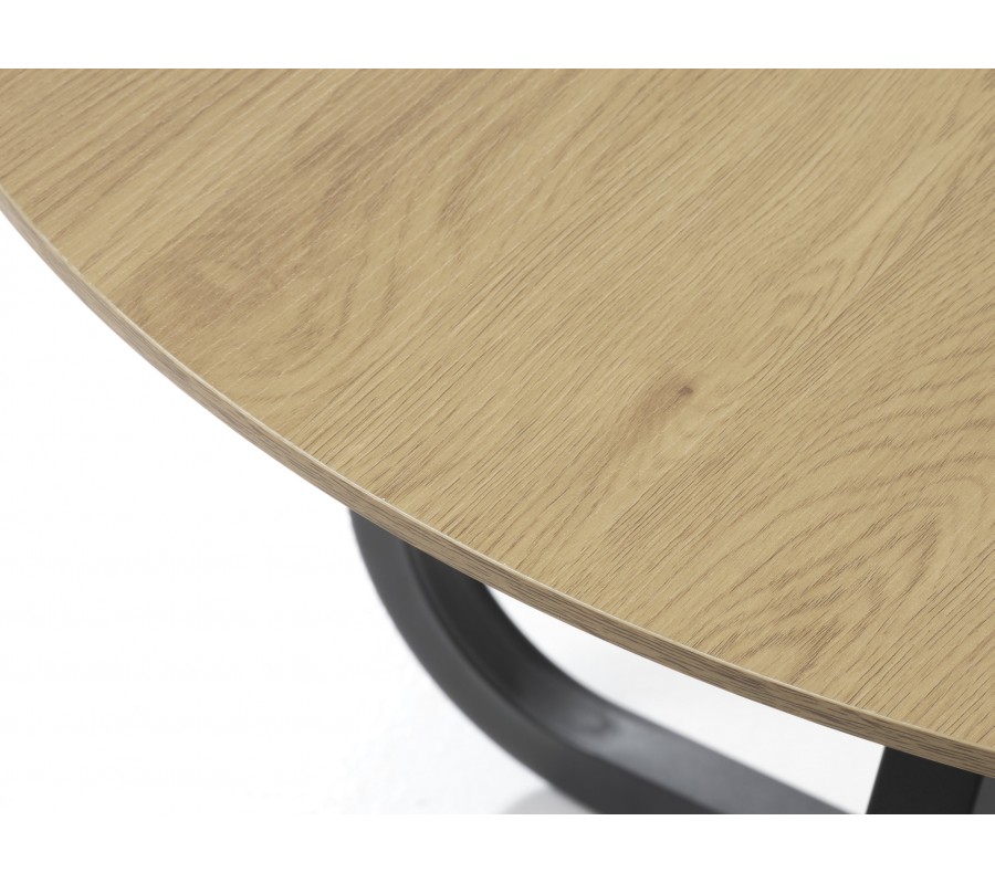 Stôl má okrúhlu vrchnú dosku v svetlom hnedom dubovom prevedení s pravidelnou kresbou letokruhov. Je vyrobená z kvalitnej dyhy s melamínovým povrchom. Ten jej zaručí vysokú pevnosť a odolnosť voči teplu aj vlhkosti. Stôl je tak ideálny aj na každodenné používanie.