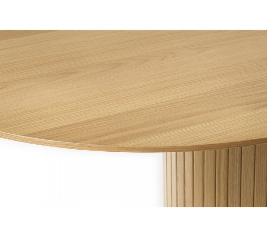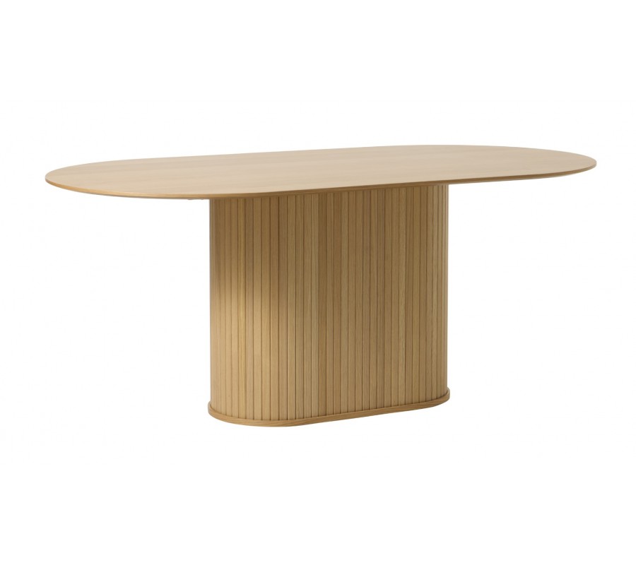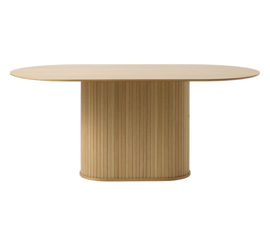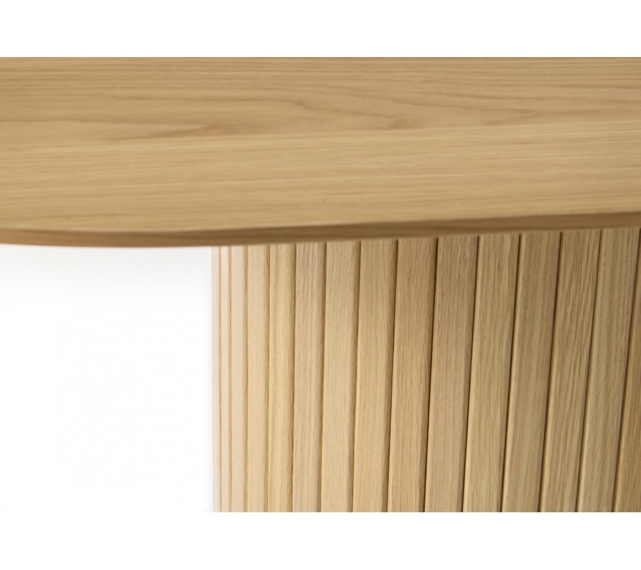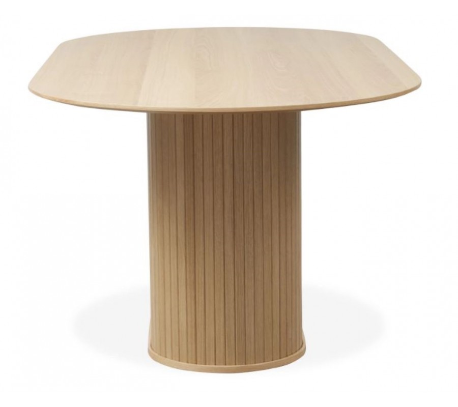 Škandinávsky oválny jedálenský stôl Bornholm s mohutnou nohou s lamelovým dekorom vo svetlom hnedom dubovom prevedení 180 cm