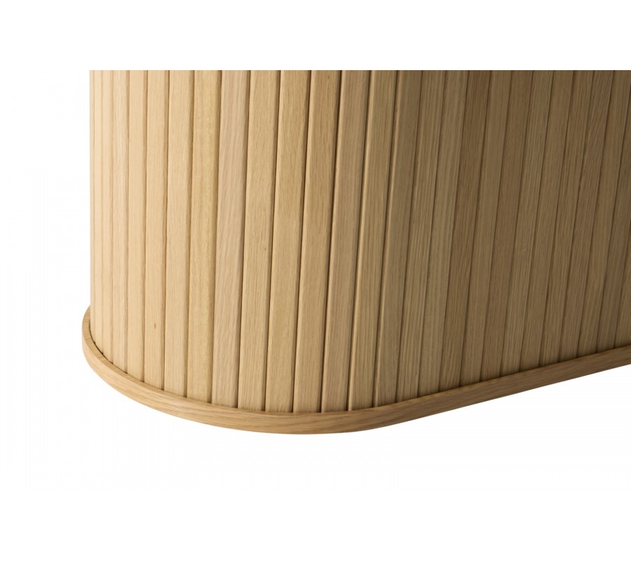 Konštrukcia kombinuje MDF a pravú dubovú dyhu, ktorej prirodzená kresba letokruhov dodáva povrchu autentický prírodný vzhľad. Svetlý hnedý odtieň zvýrazňuje teplý charakter materiálu a podporuje celkový harmonický škandinávsky vizuál.