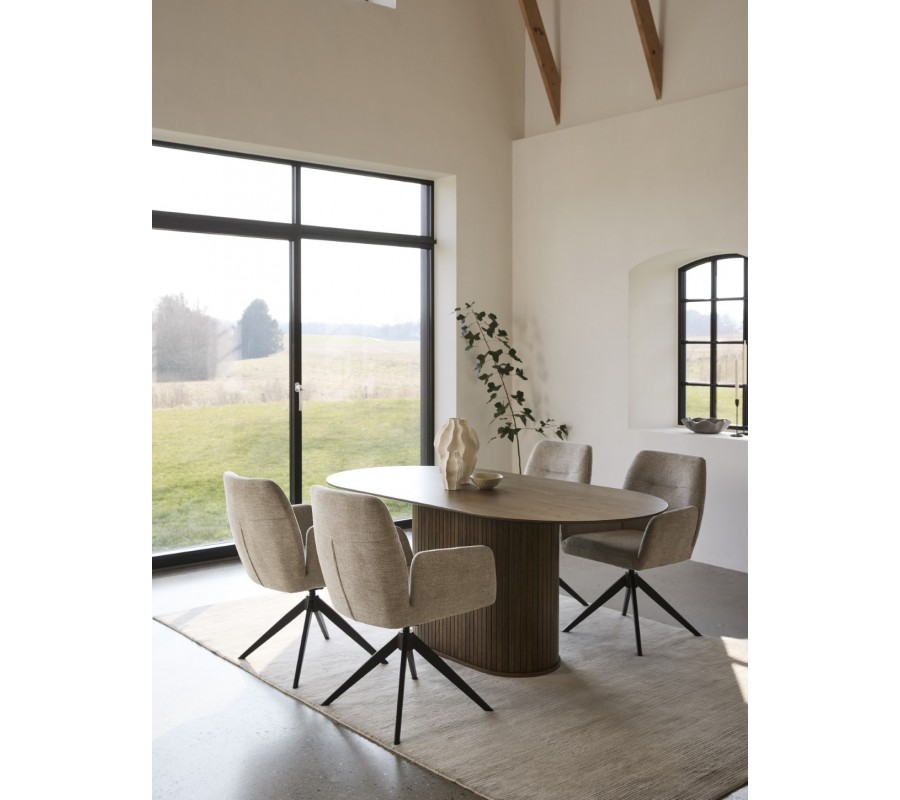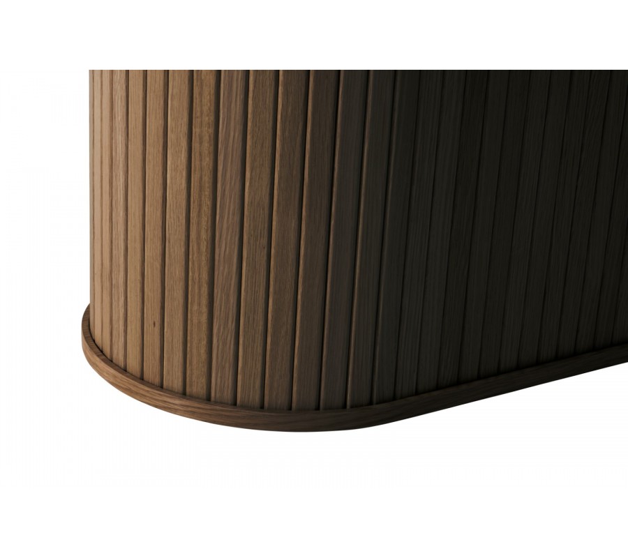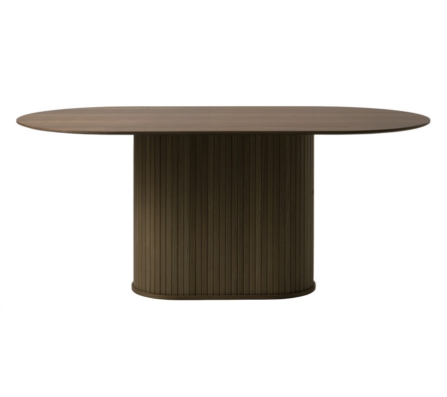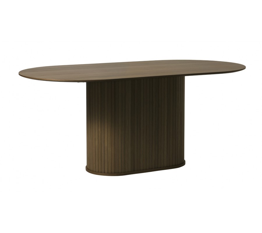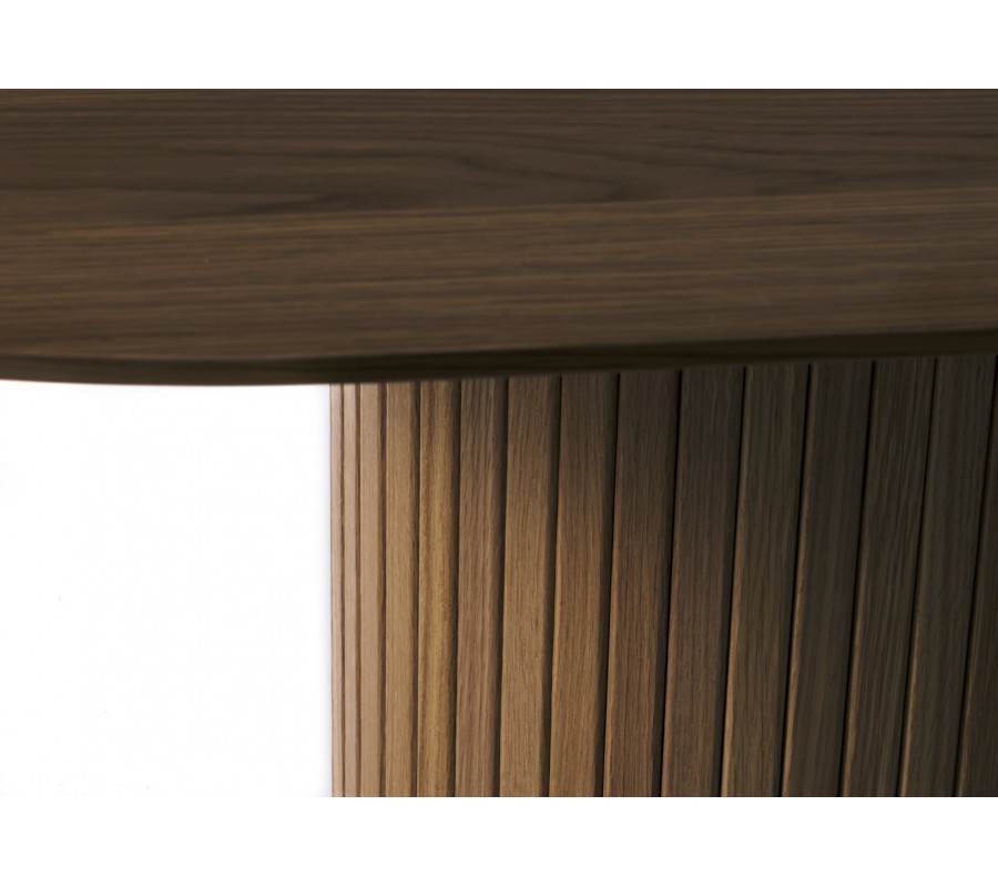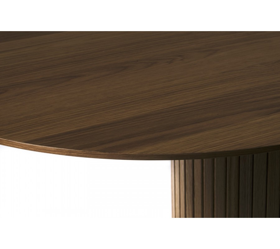 Stôl má elegantnú siluetu, v ktorej dominujú pôvabné zaoblené línie. Dizajnu dominuje mohutná oválna noha. Po obvode ju zdobí vertikálne vykladaný lamelový reliéf, dodávajúci nábytku štýlový retro charakter. V spodnej časti je doplnená o rozšírený rám pre lepšiu stabilitu. Vo vrchnej časti je na nej položená hladká oválna doska so štíhlym profilom, ktorá pôsobí odľahčene.