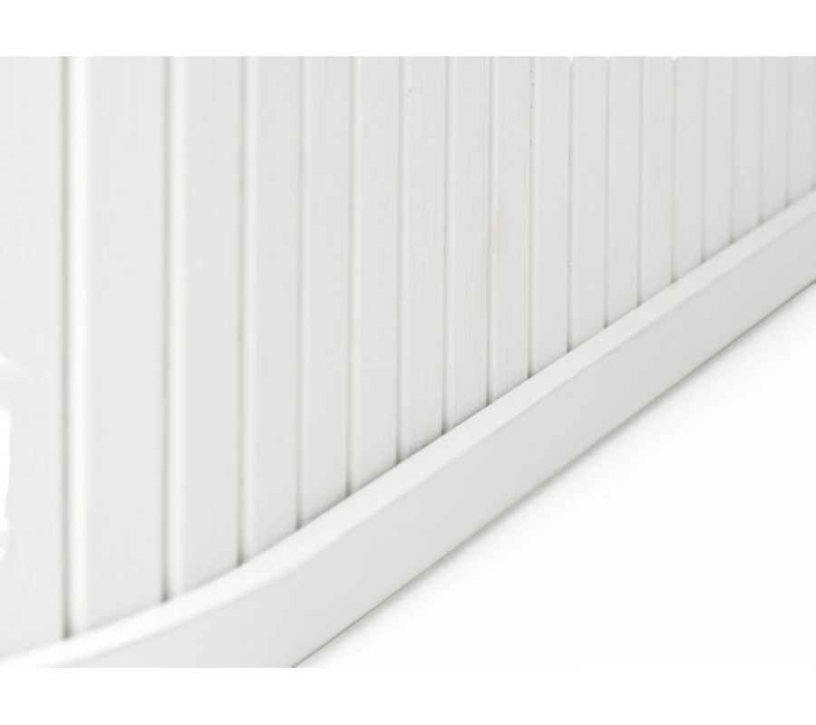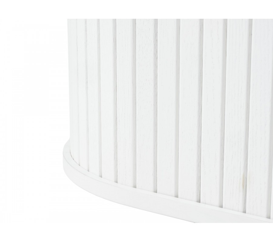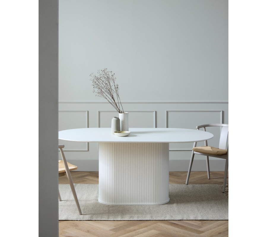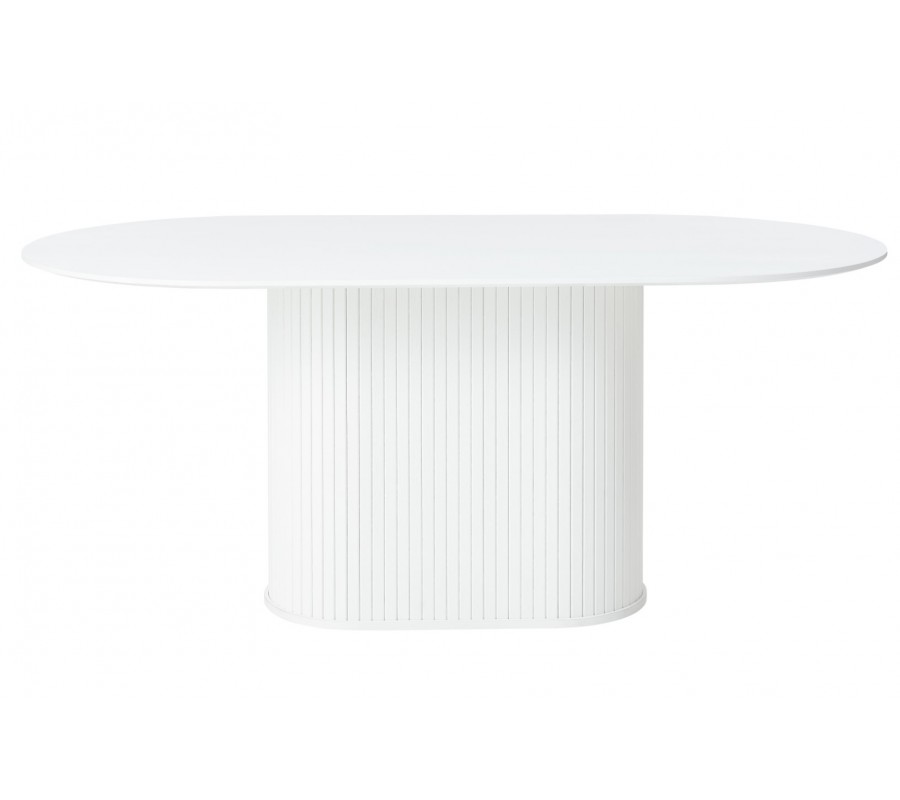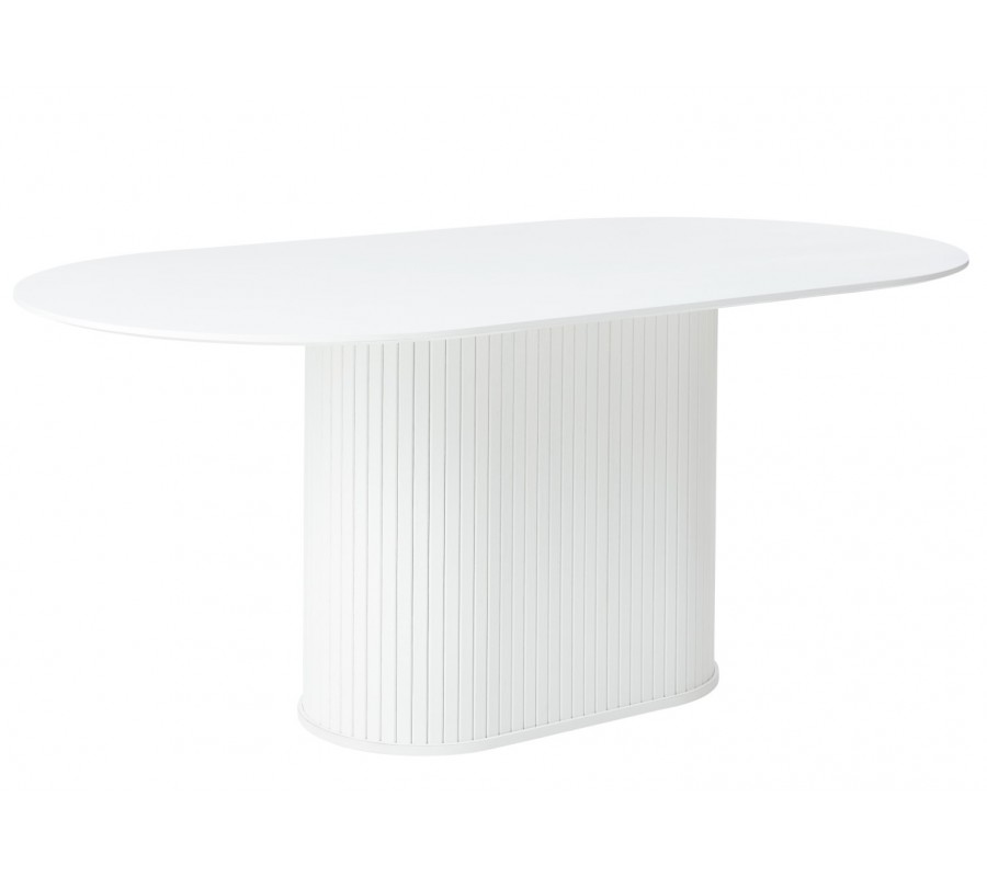 Moderný oválny biely jedálenský stôl Bornholm s hladkou vrchnou doskou a mohutnou nohou s lamelovým dekorom 180 cm